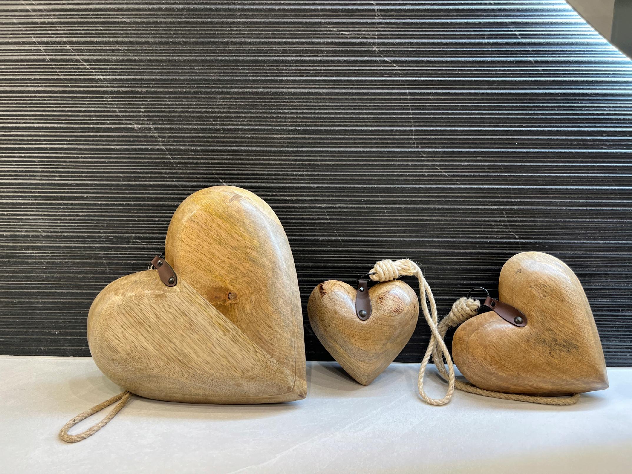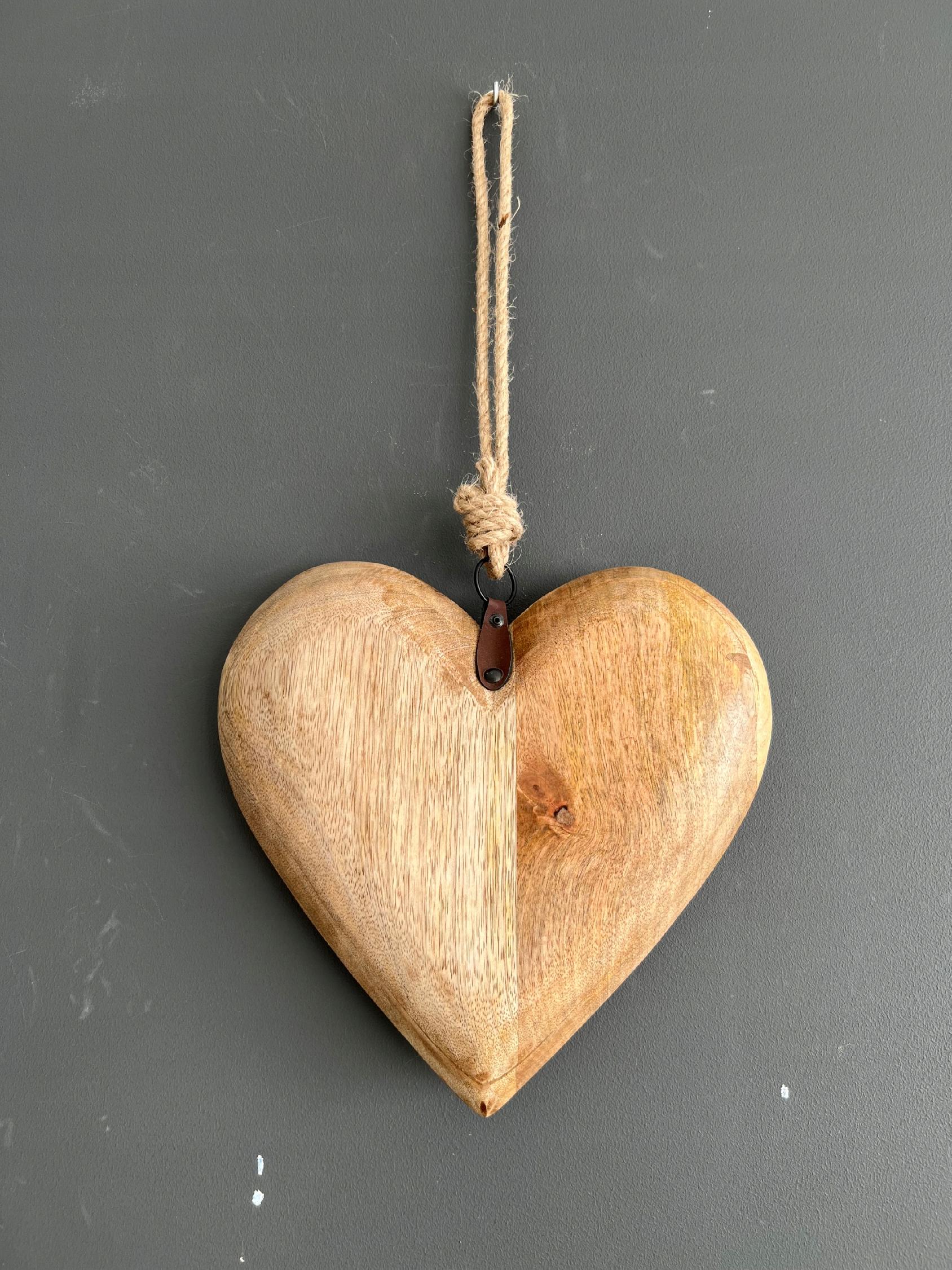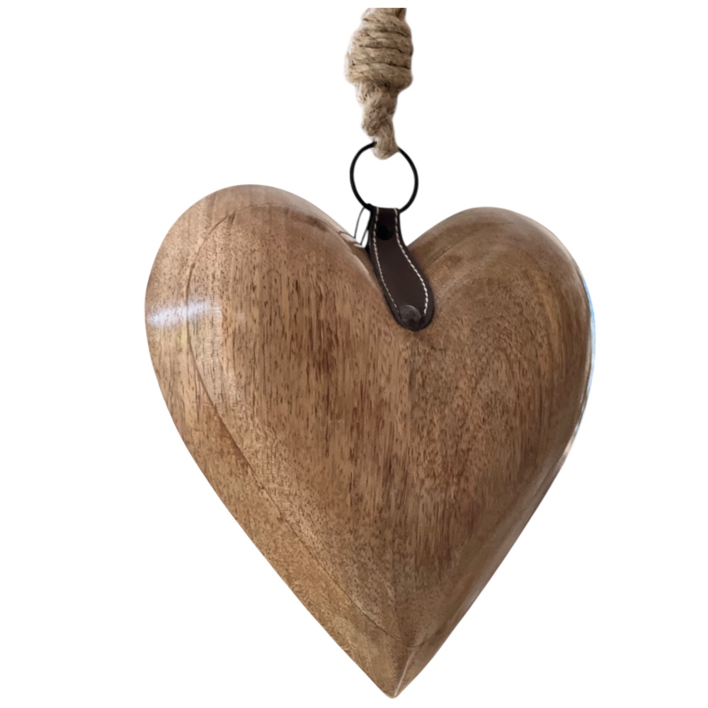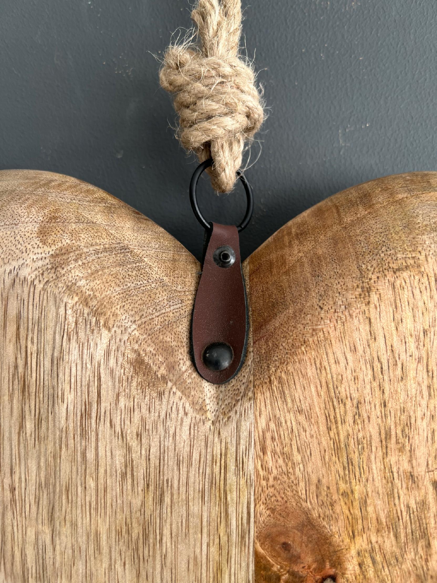 Duże masywne drewniane serce, z ozdobnym skórzanym wykończeniem.
