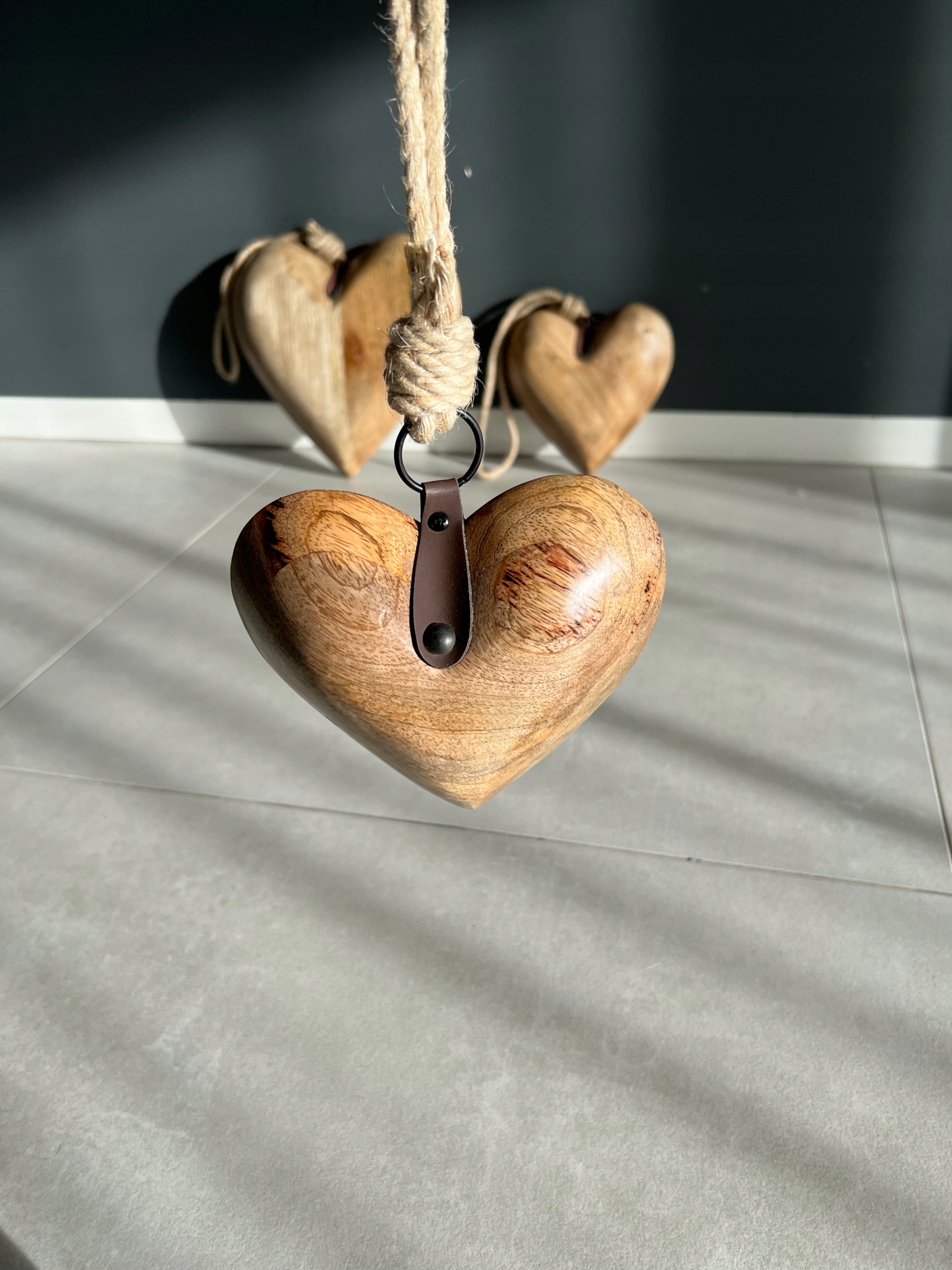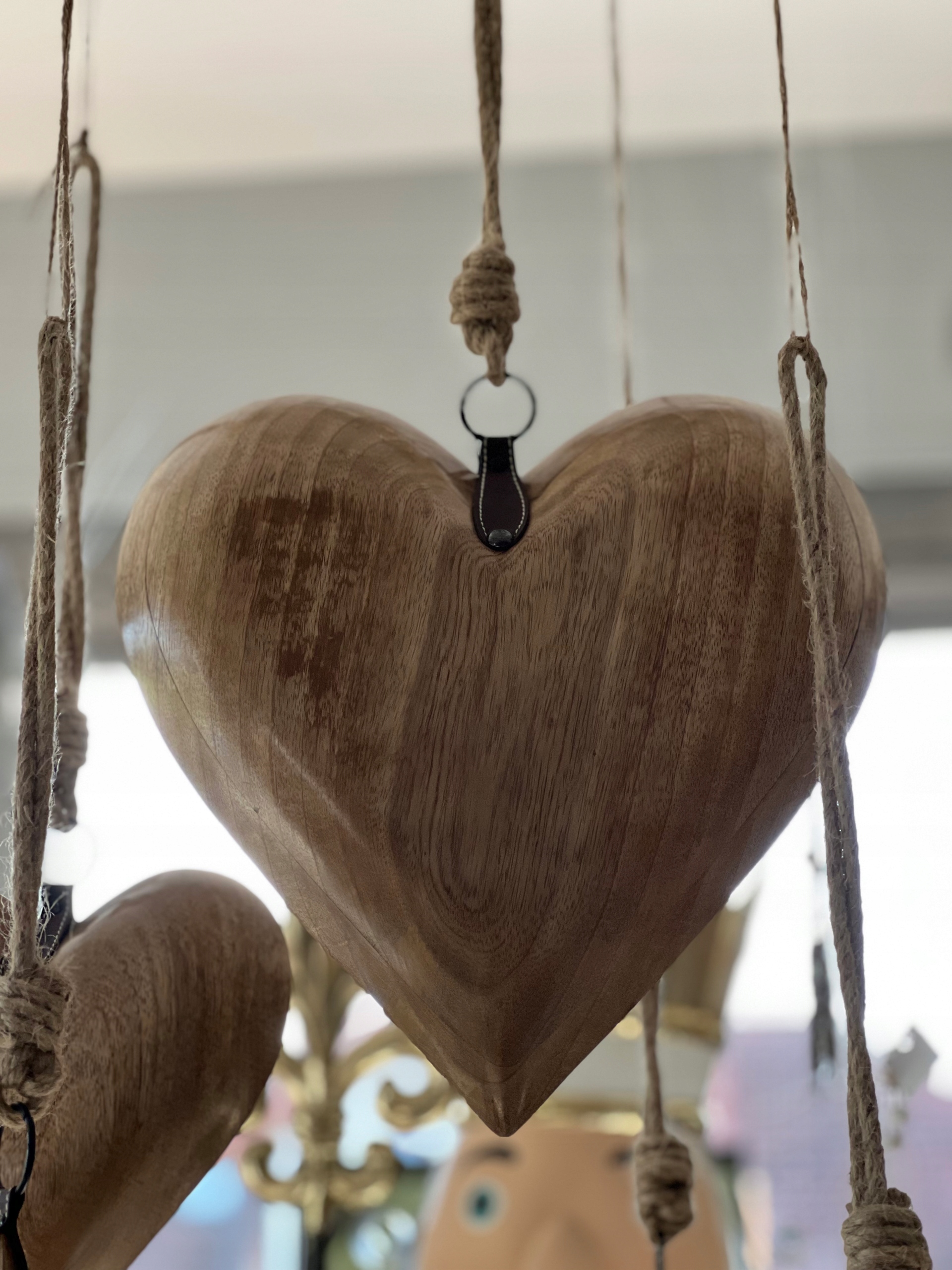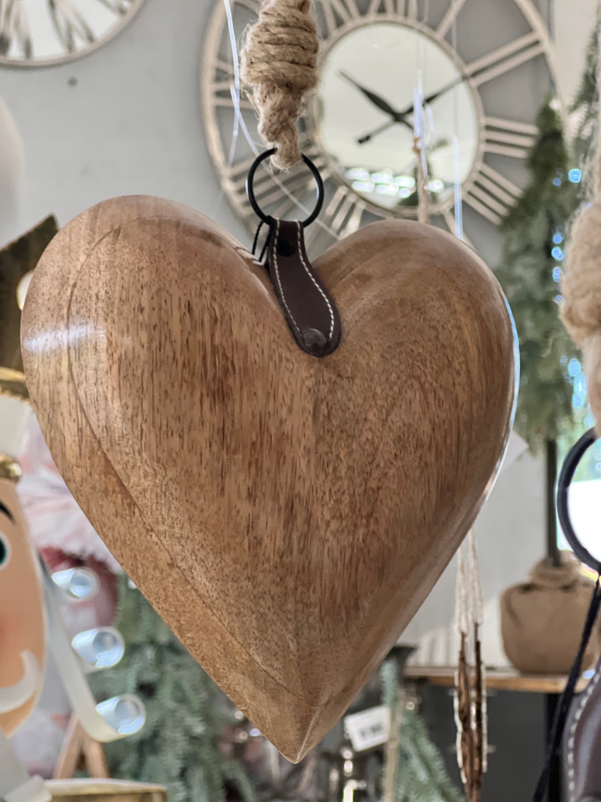 Duże masywne drewniane serce, z ozdobnym skórzanym wykończeniem.