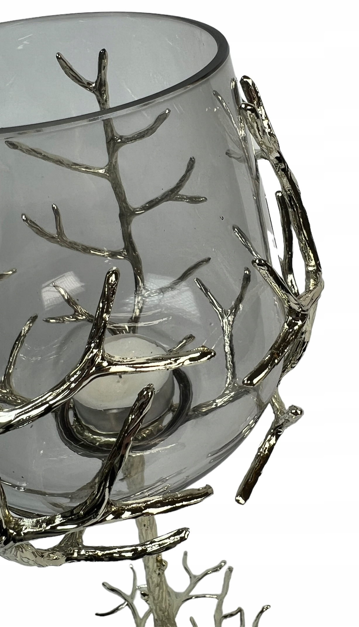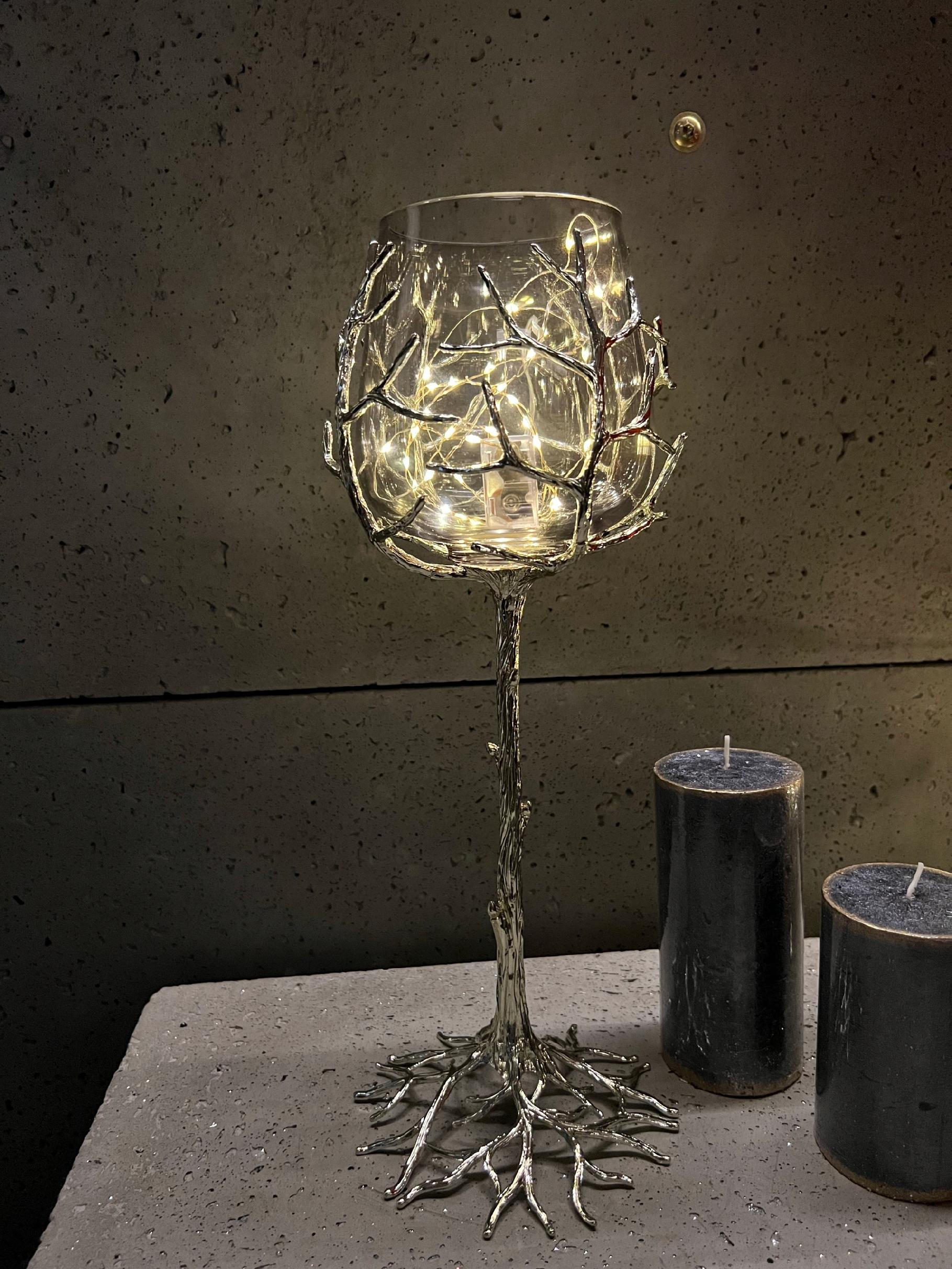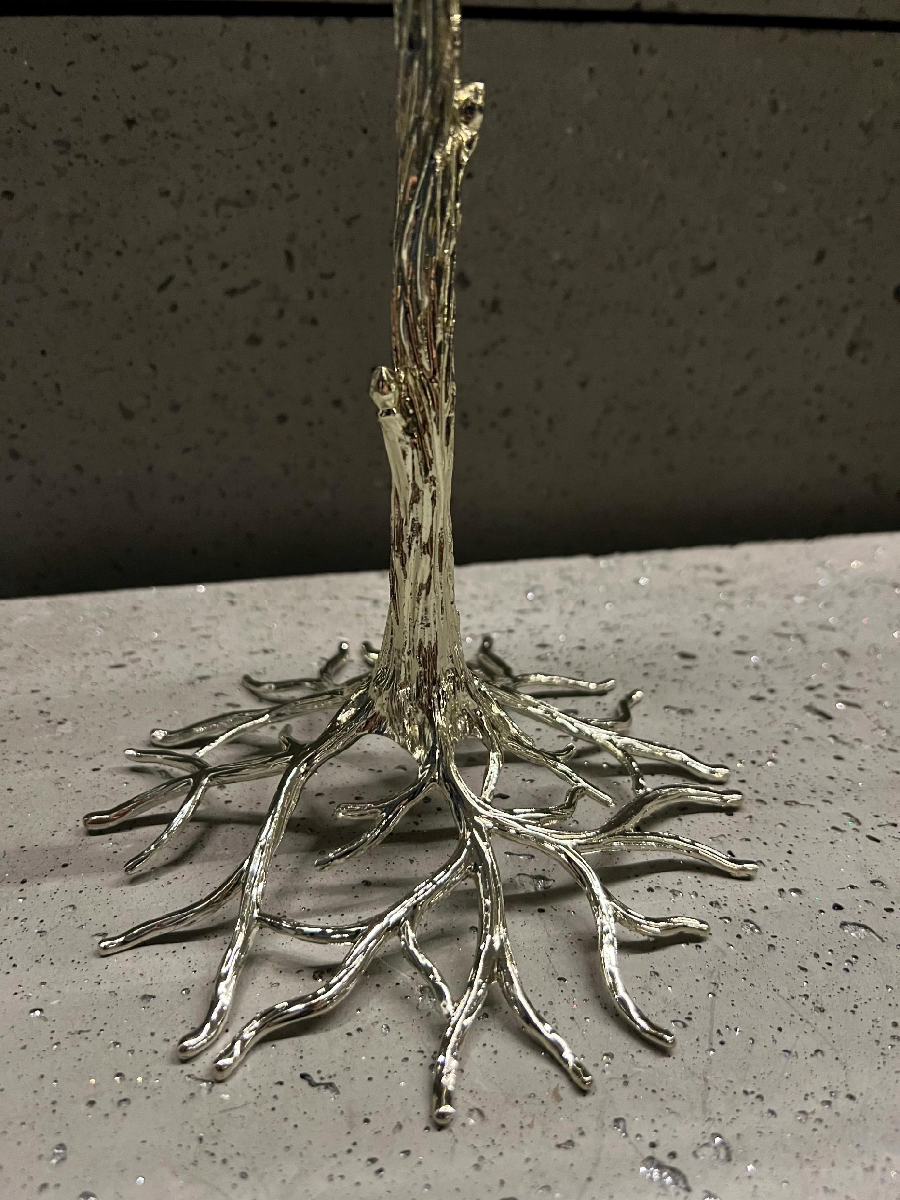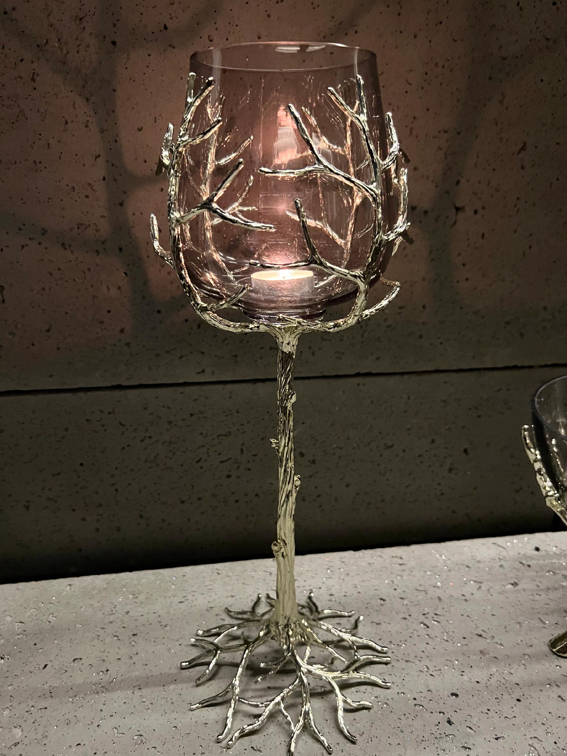 Noga świecznika wygląda jak pień drzewa, która oplata  swoimi korzeniami kielich.