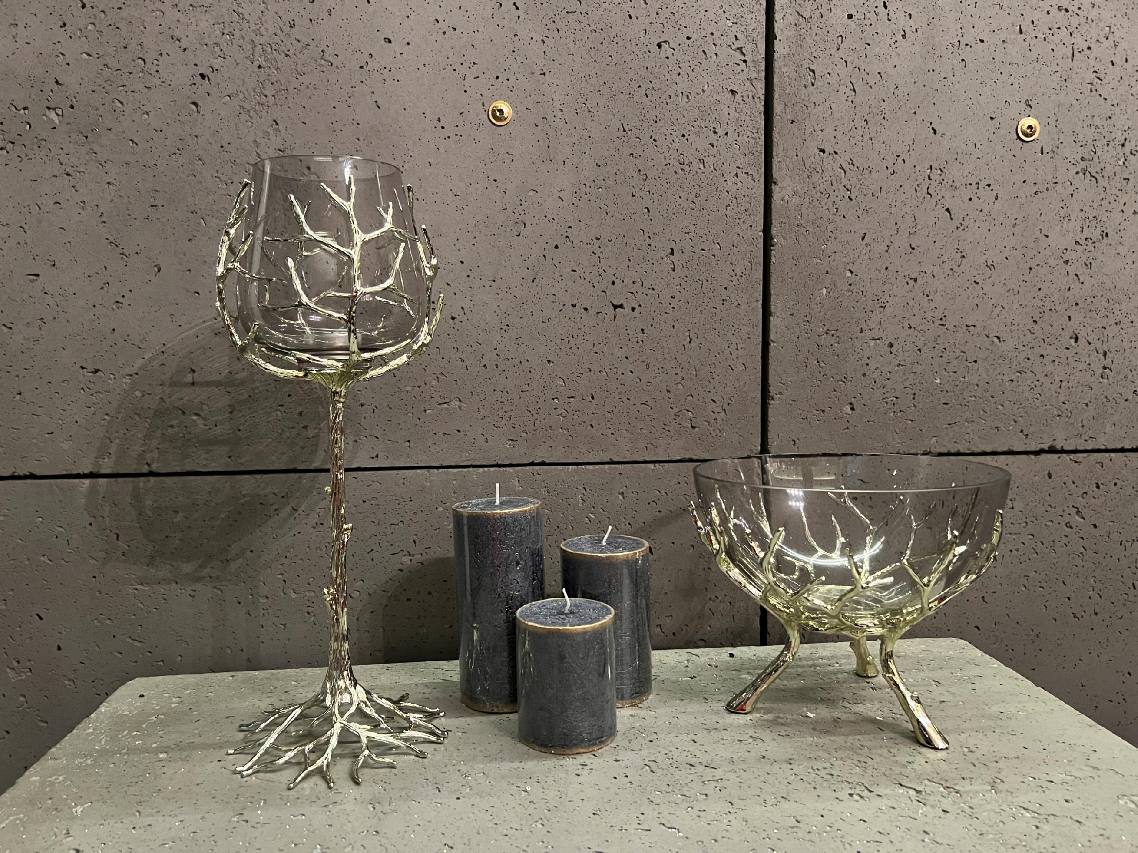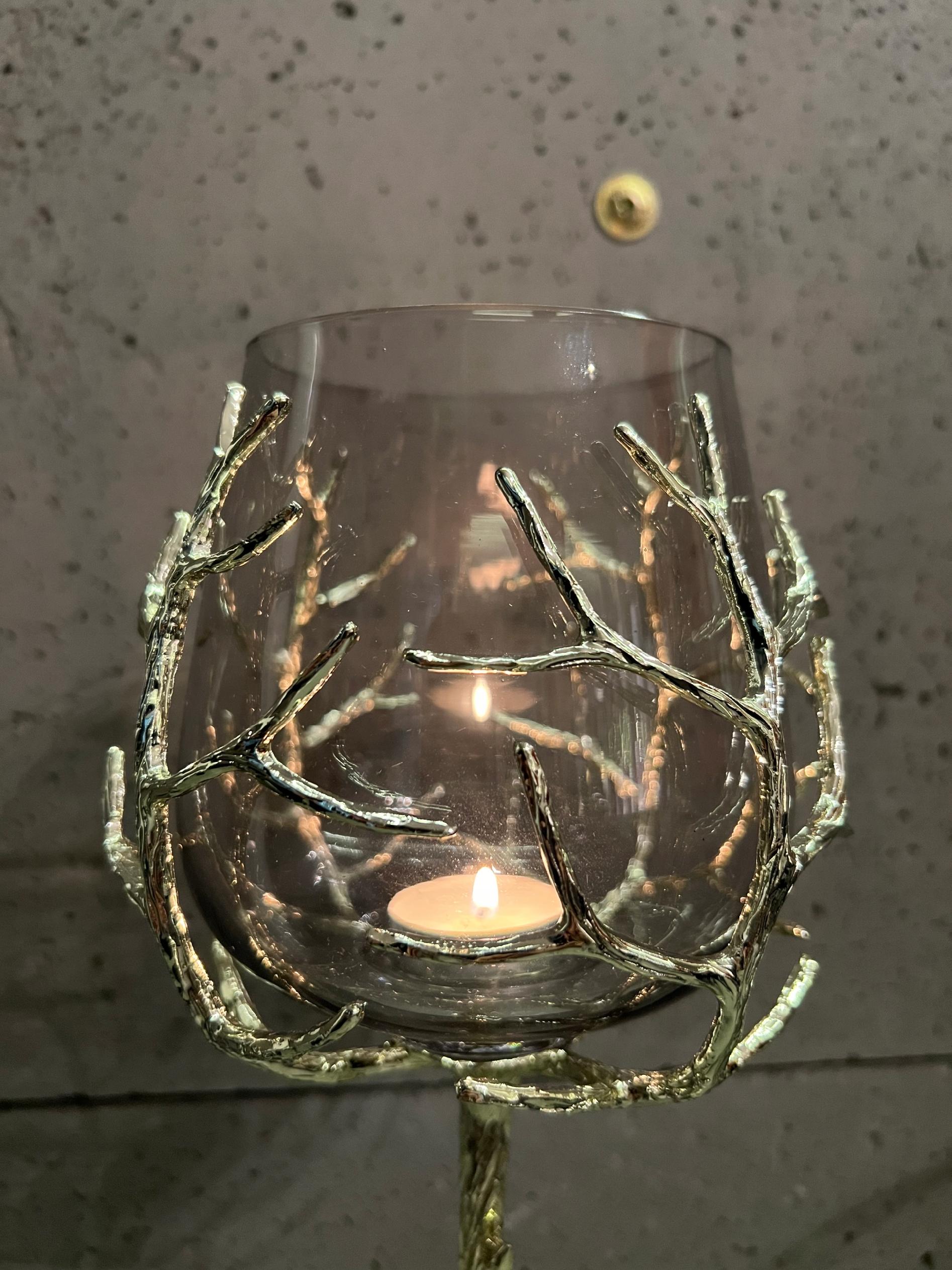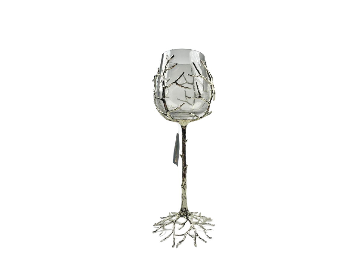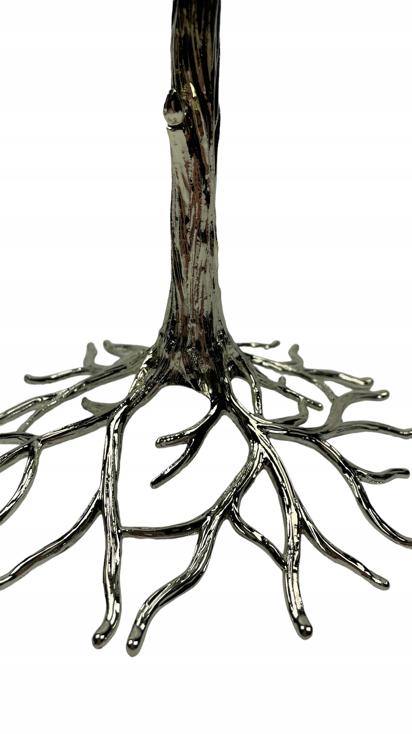 Noga świecznika wygląda jak pień drzewa, która oplata  swoimi korzeniami kielich.