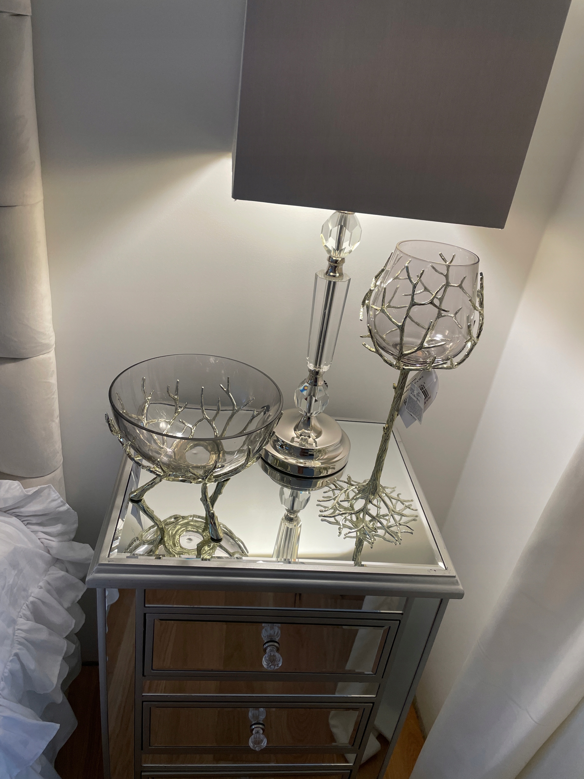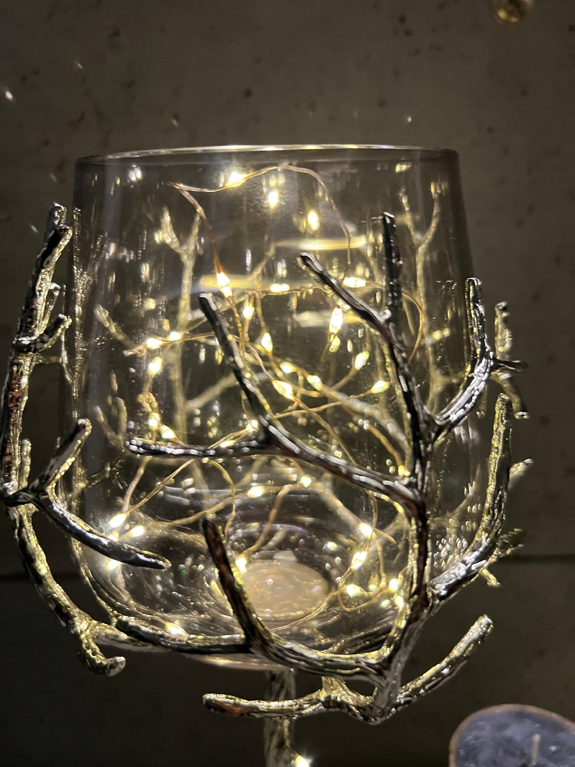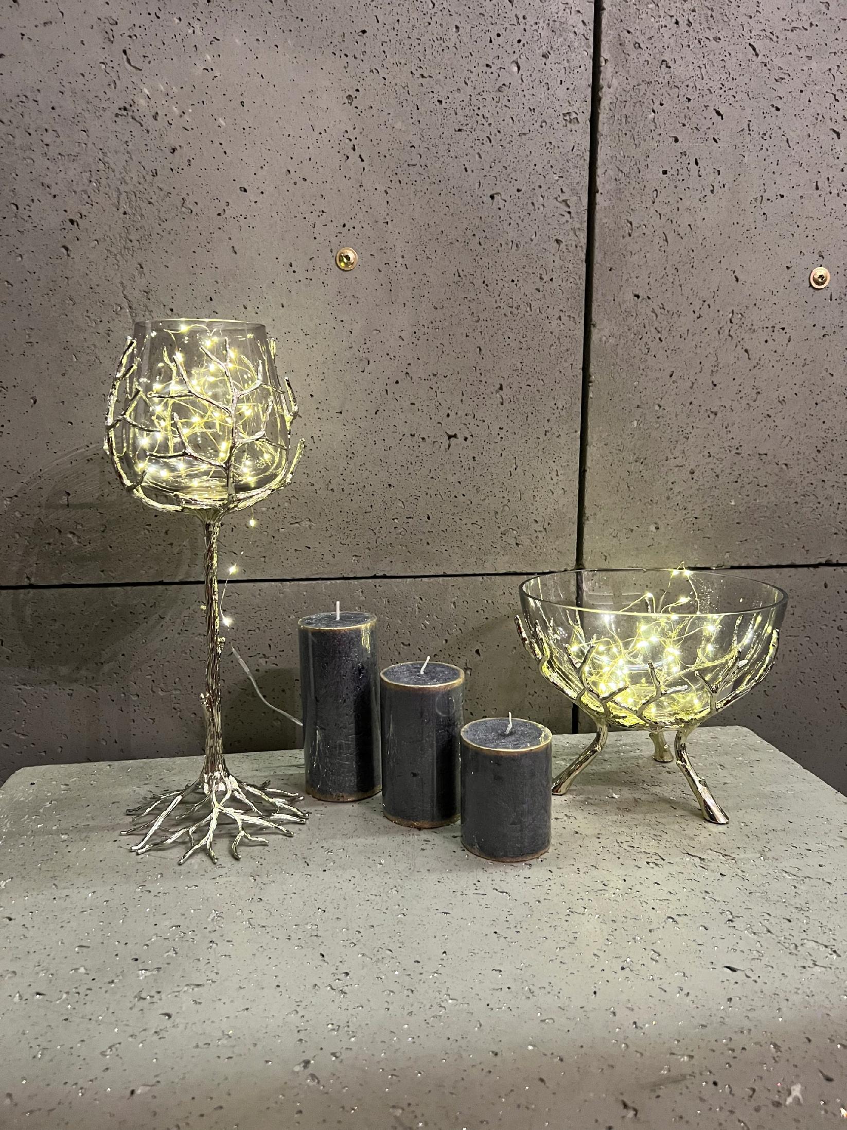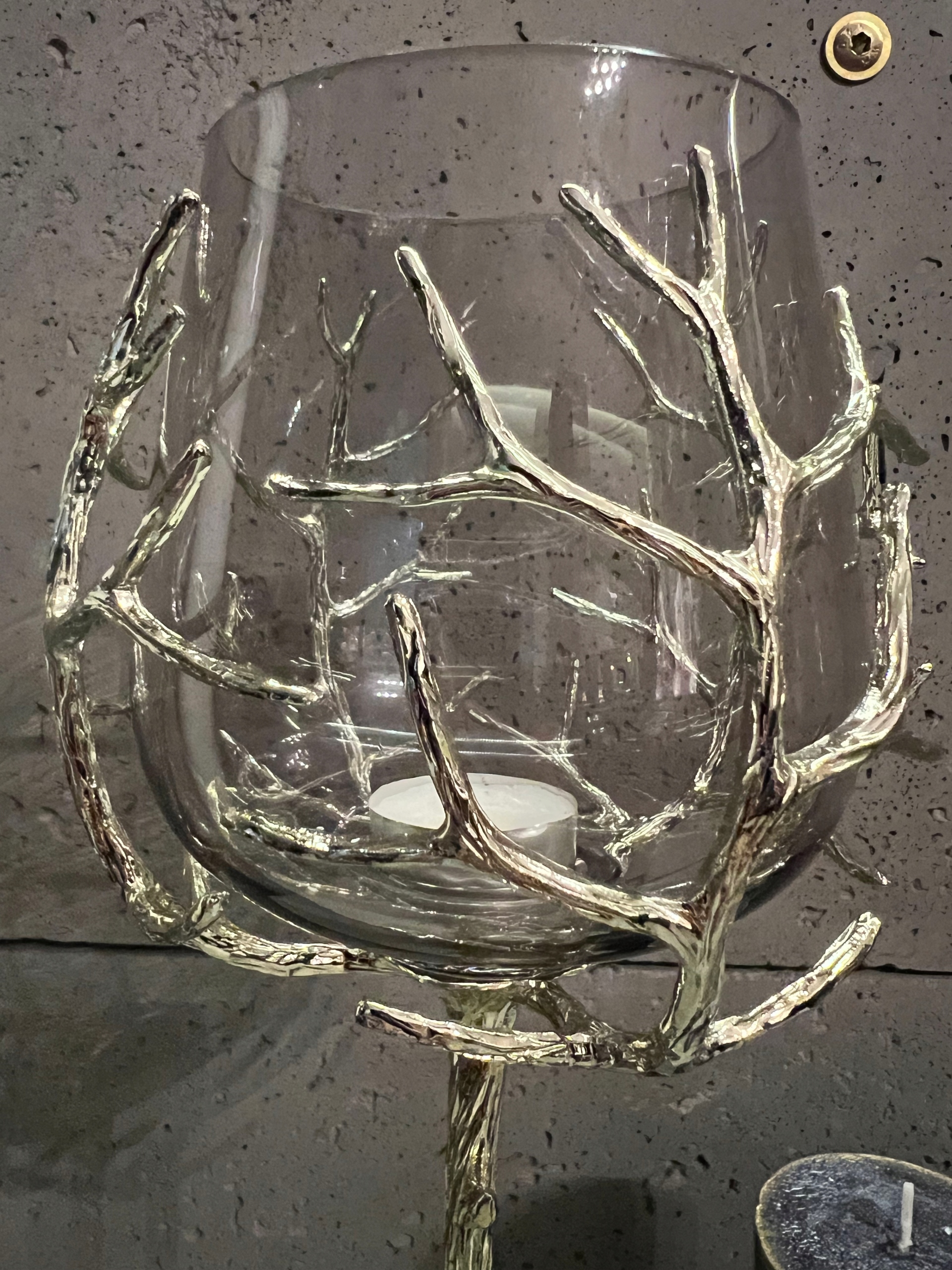 Noga świecznika wygląda jak pień drzewa, która oplata  swoimi korzeniami kielich.