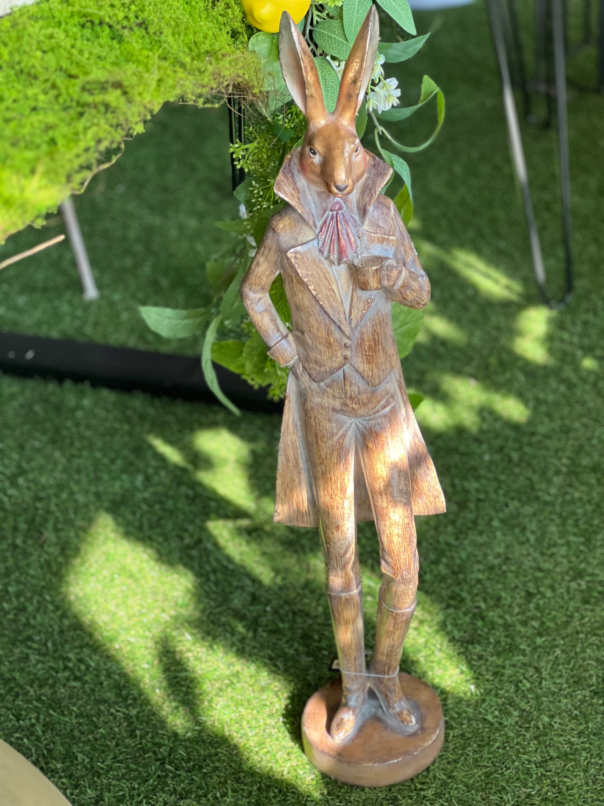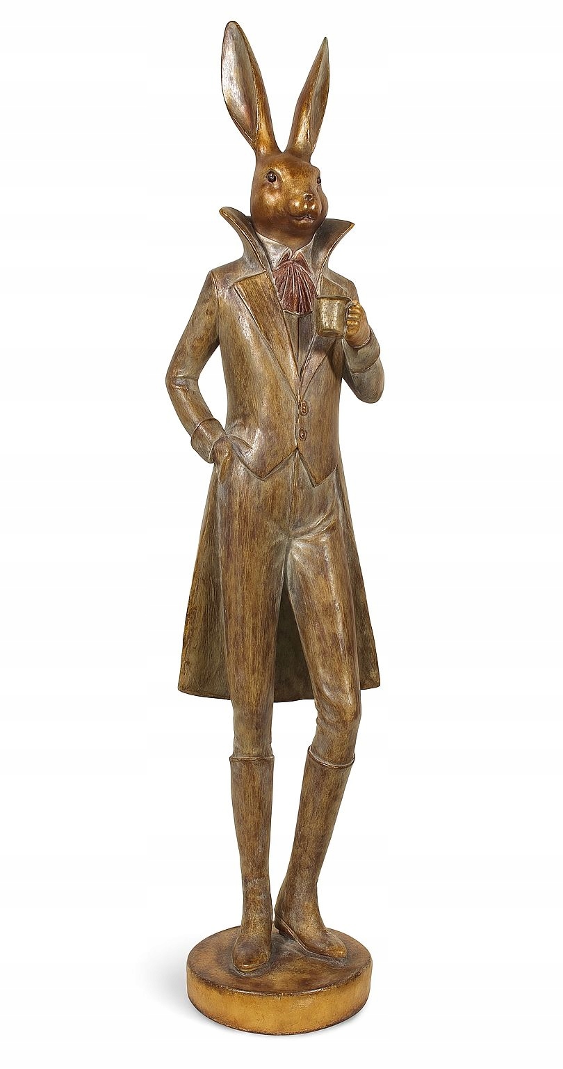 Figurka zająca trzymającego kubek w zdobnym fraku