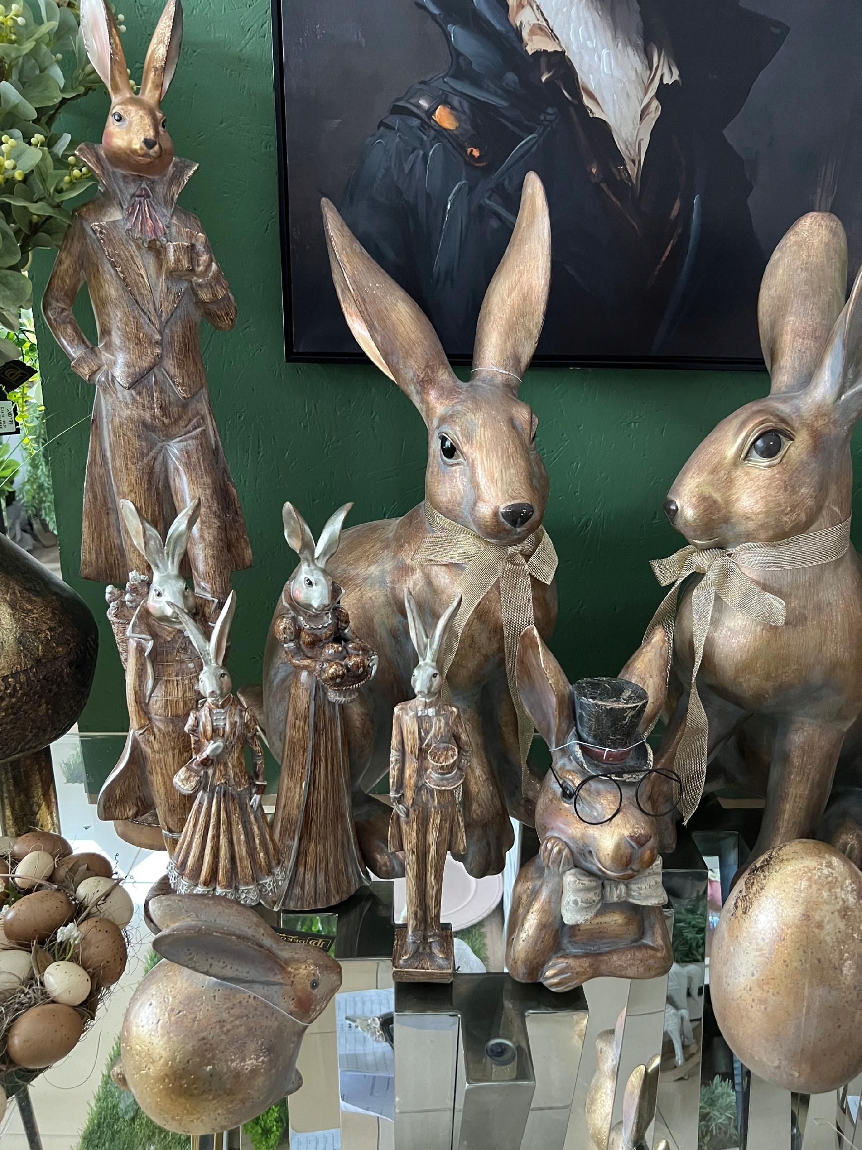 Figurka eleganckiego pana zająca wykonana z dużą precyzją, w odcieniach złoto brązowych ze srebrnymi akcentami