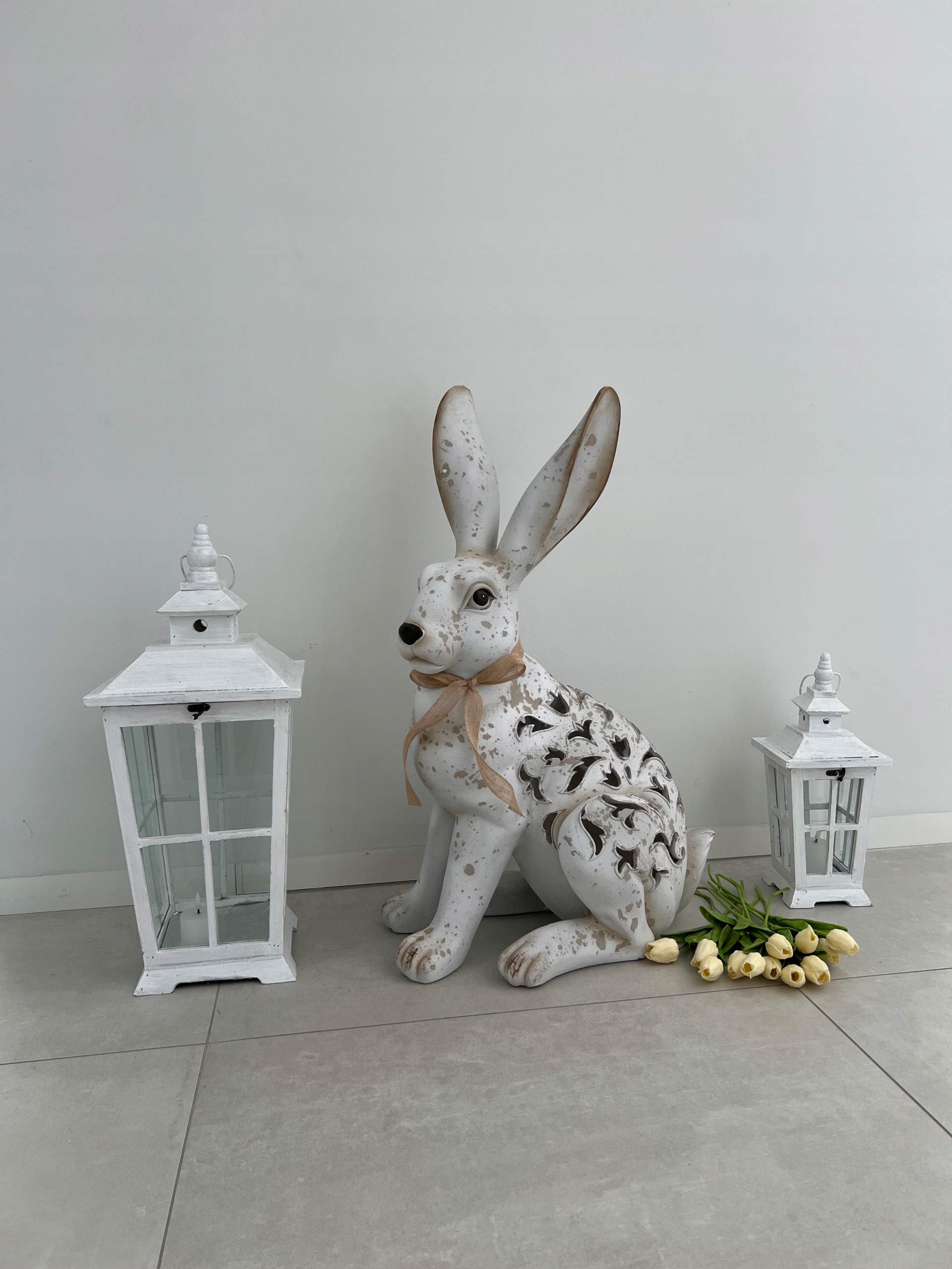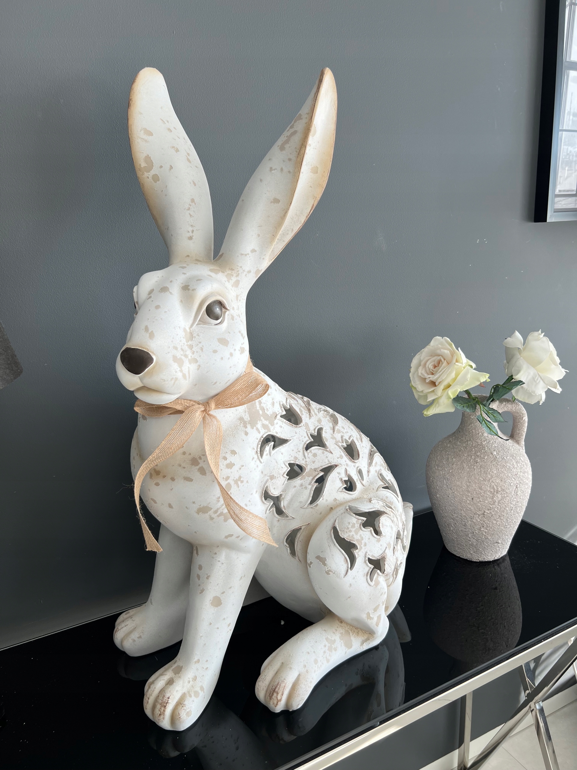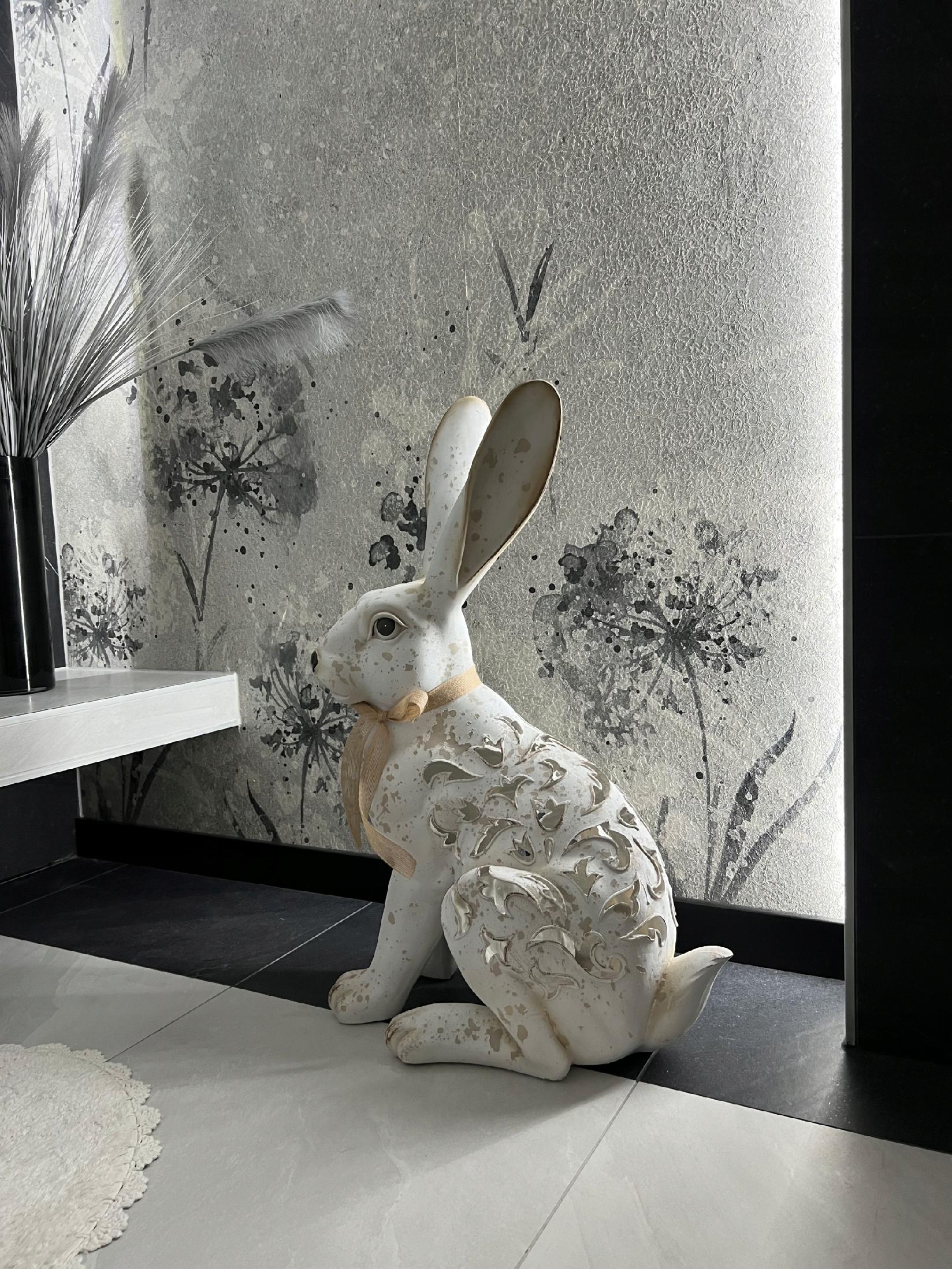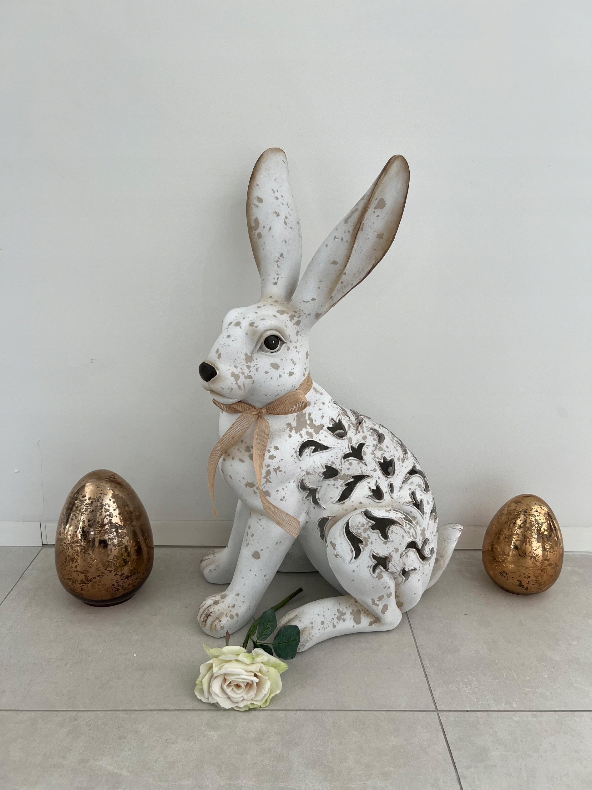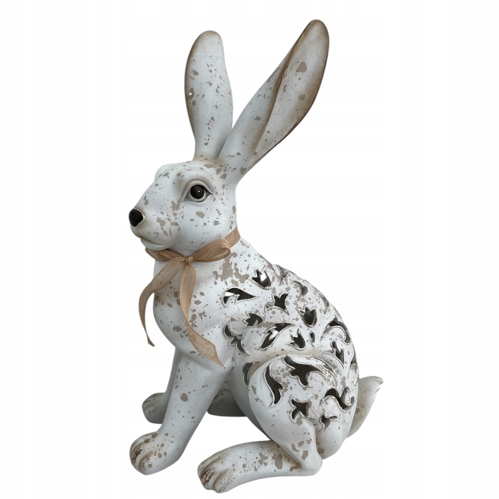 Niespotykana duża figurka białego zająca królika z ozdobnymi przetarciami i ażurową fakturą