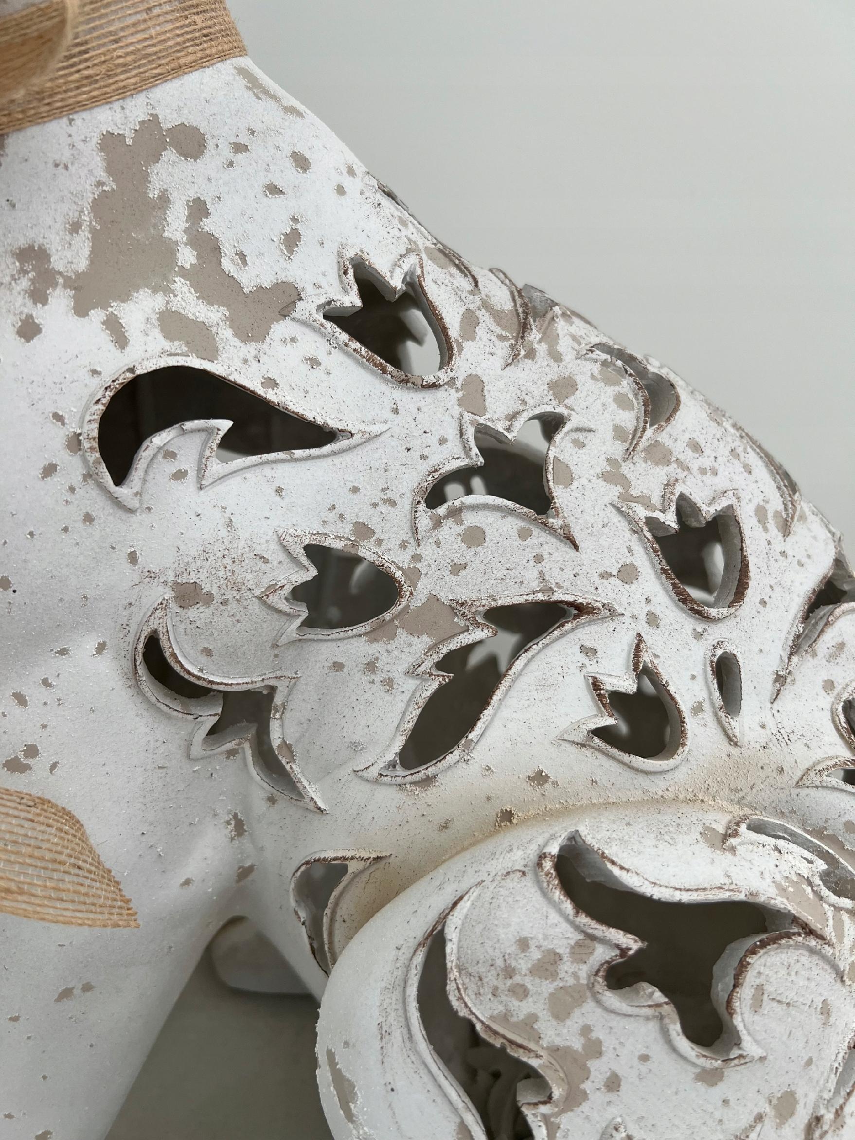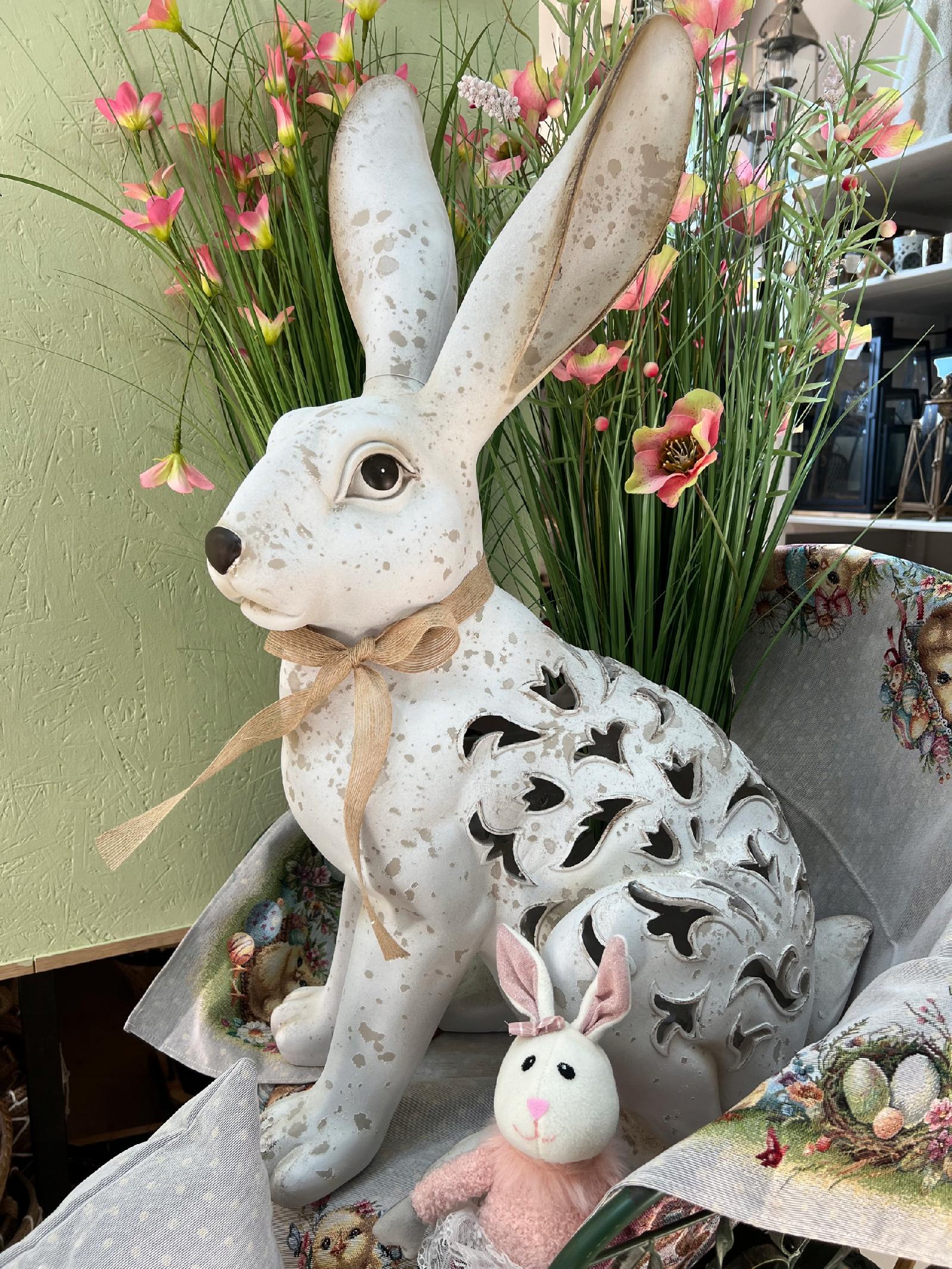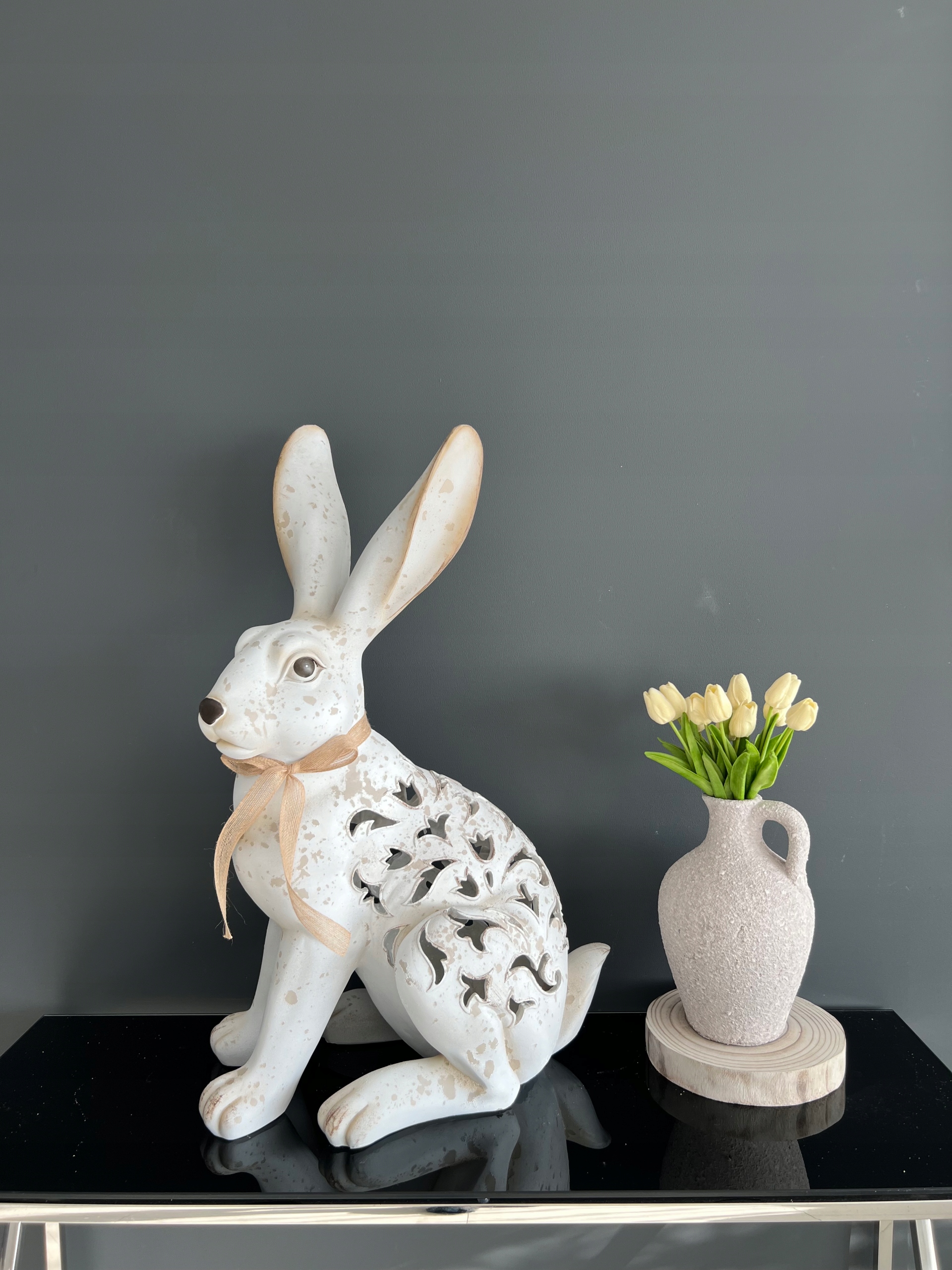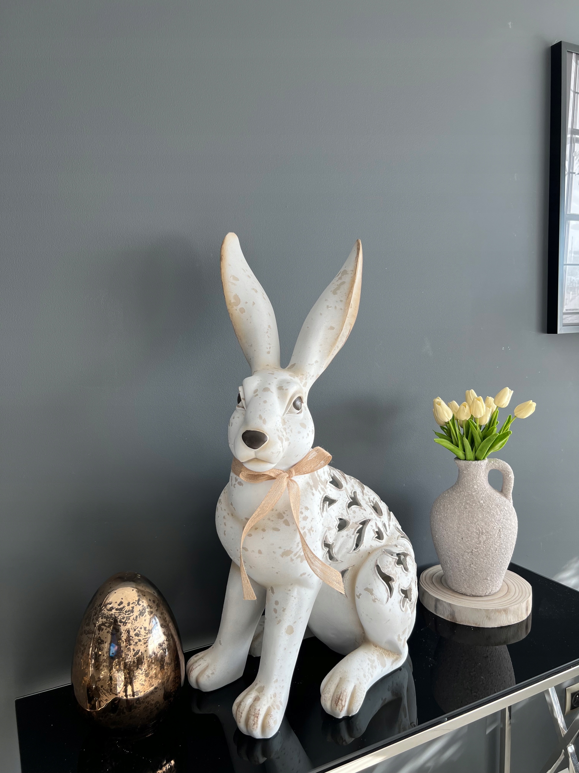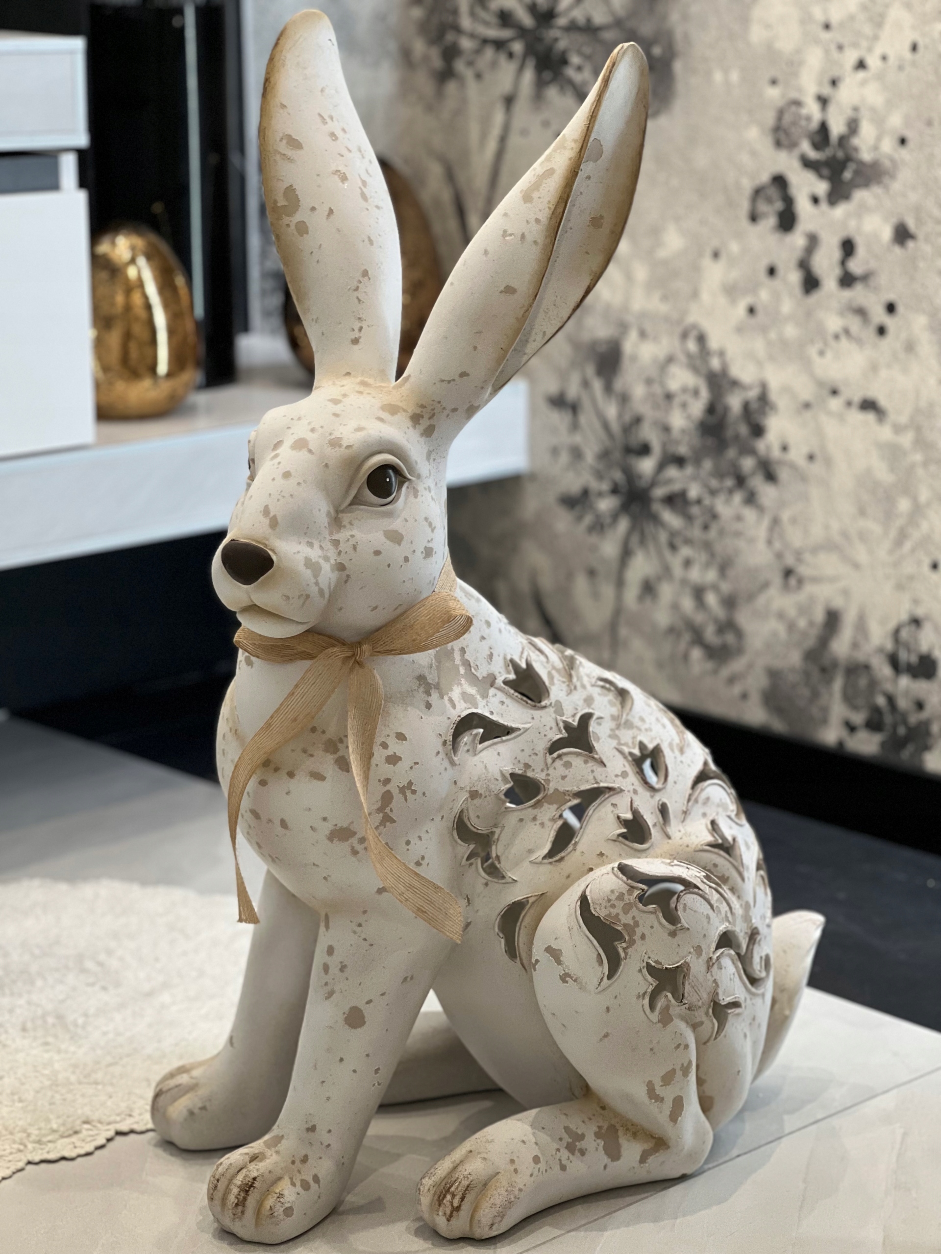 Niespotykana duża figurka białego zająca królika z ozdobnymi przetarciami i ażurową fakturą