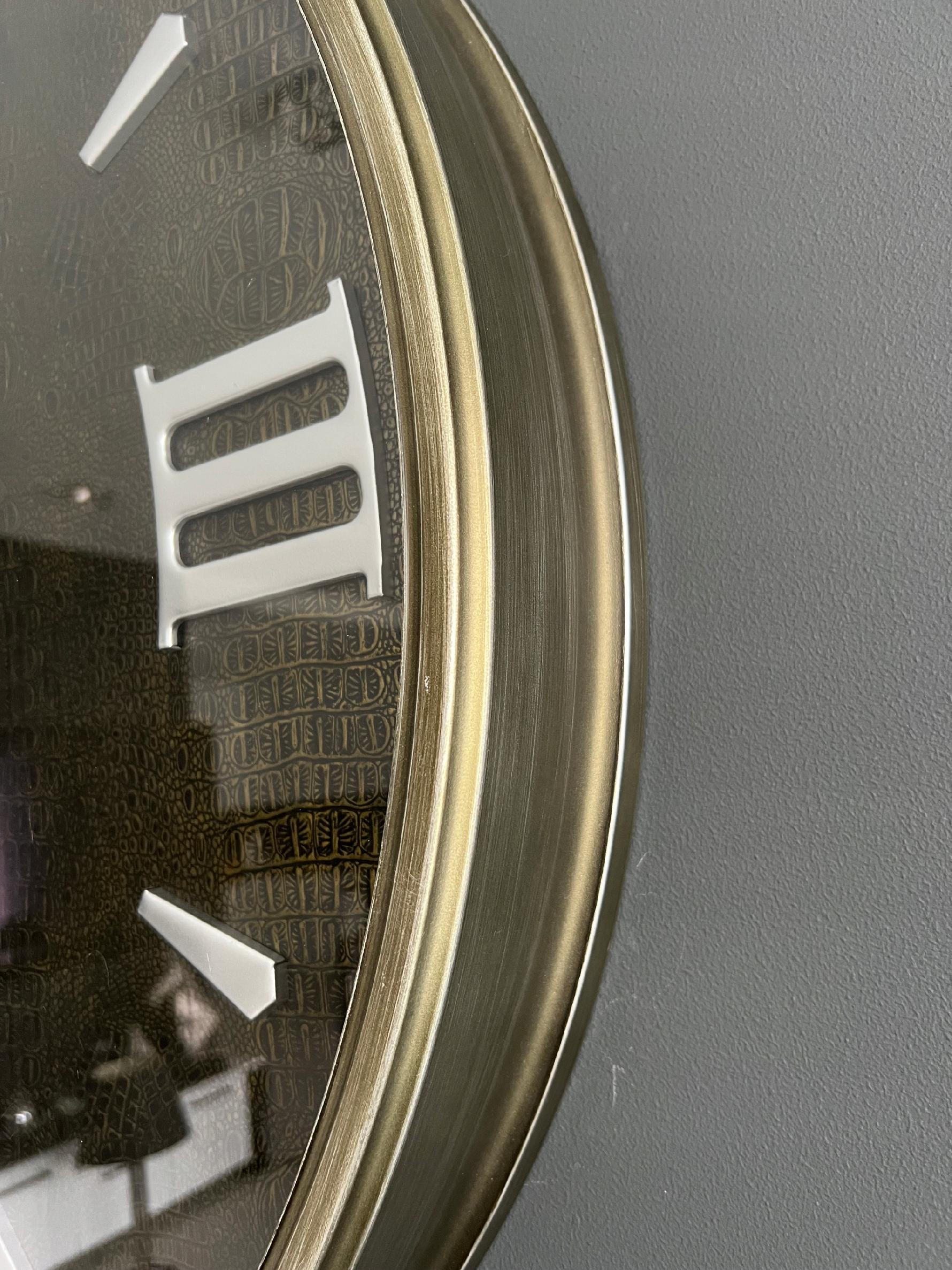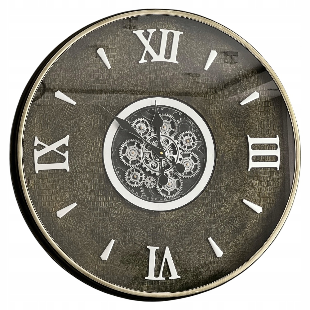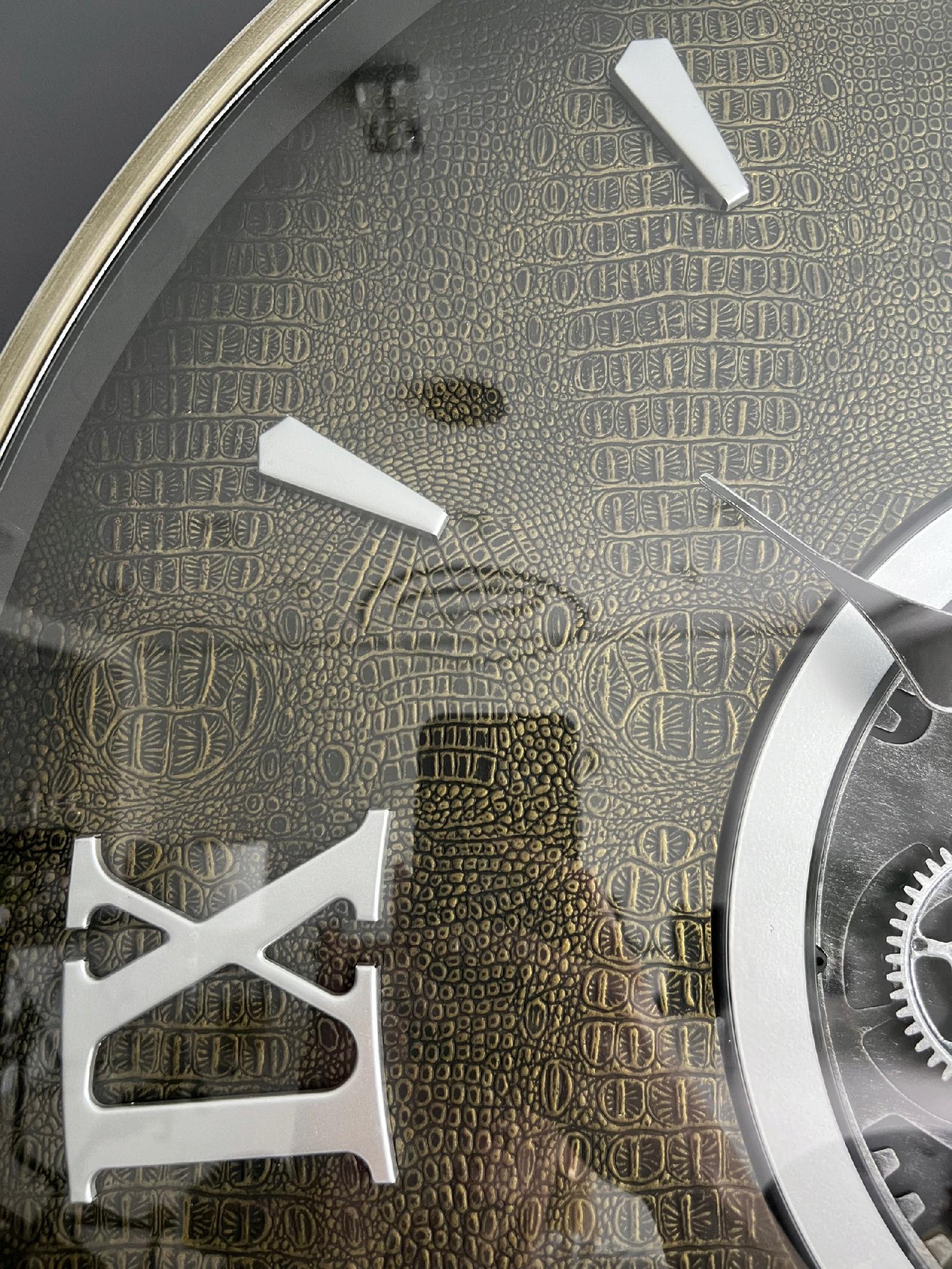 Zegar wykonany ze stali z przeszkloną szybą o ciekawej strukturze imitującej skórę węża