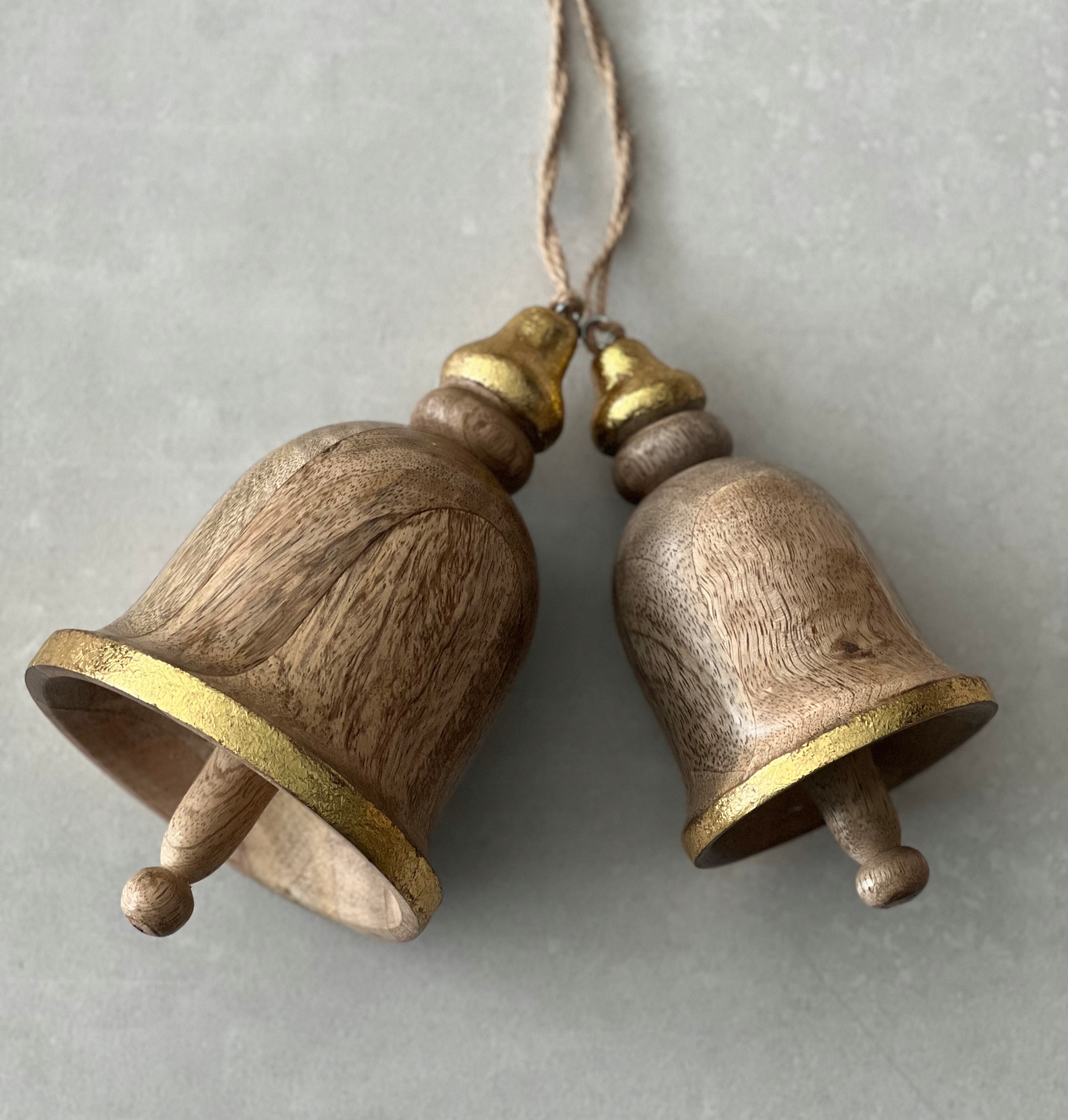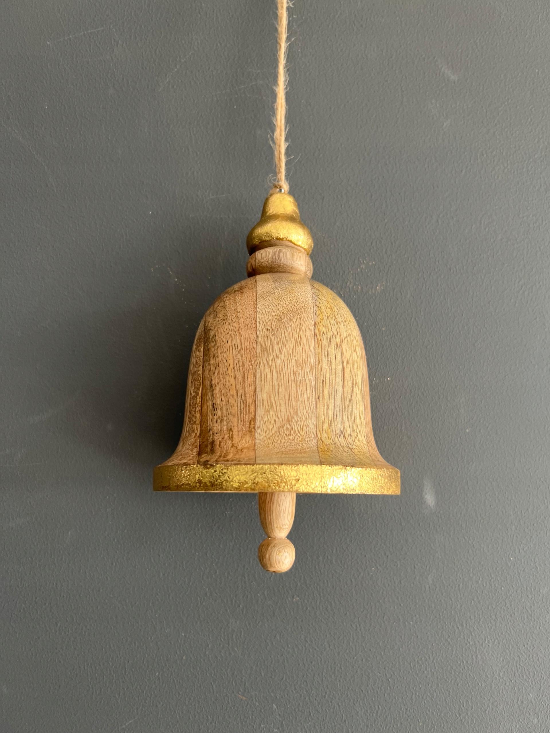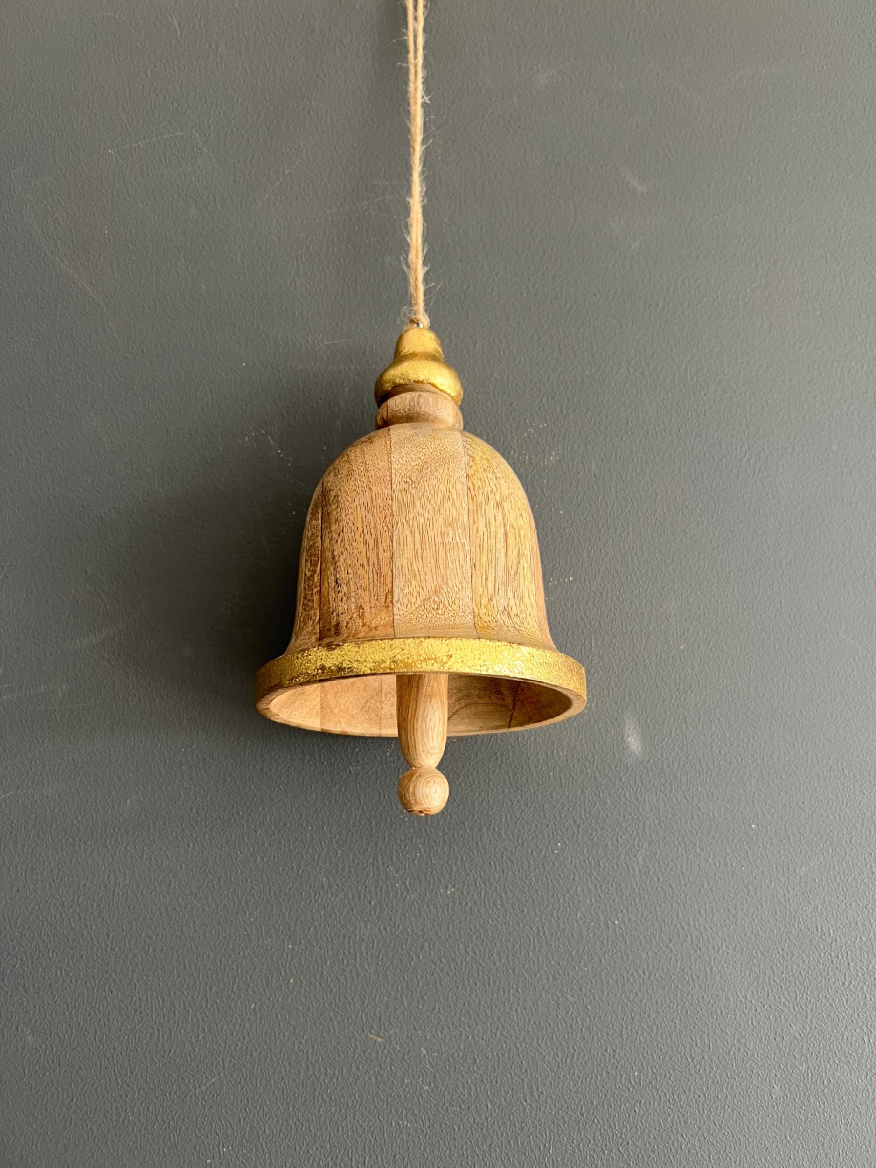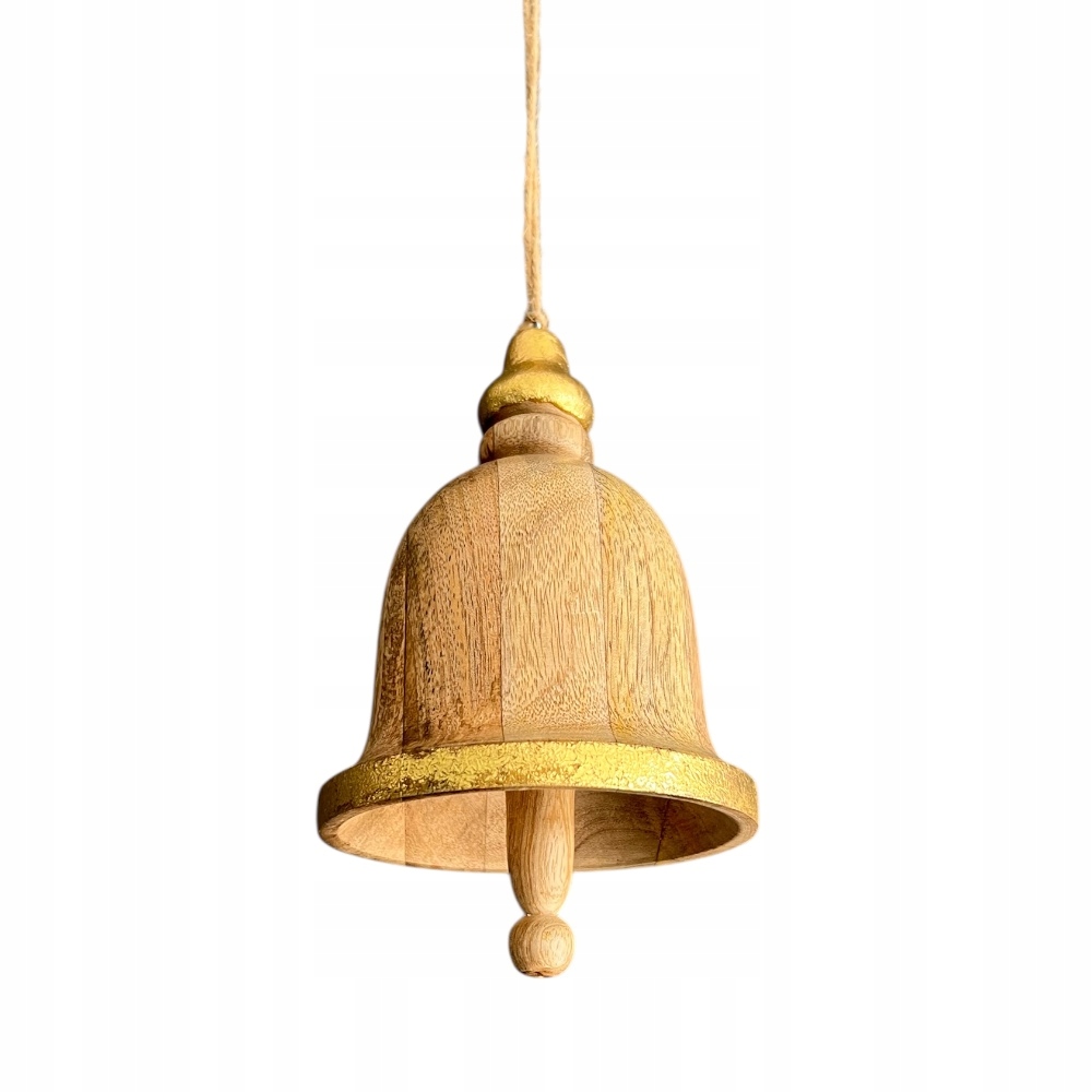 Drewniany masywny dzwonek z złotym rantem z ozdobnym sznurem