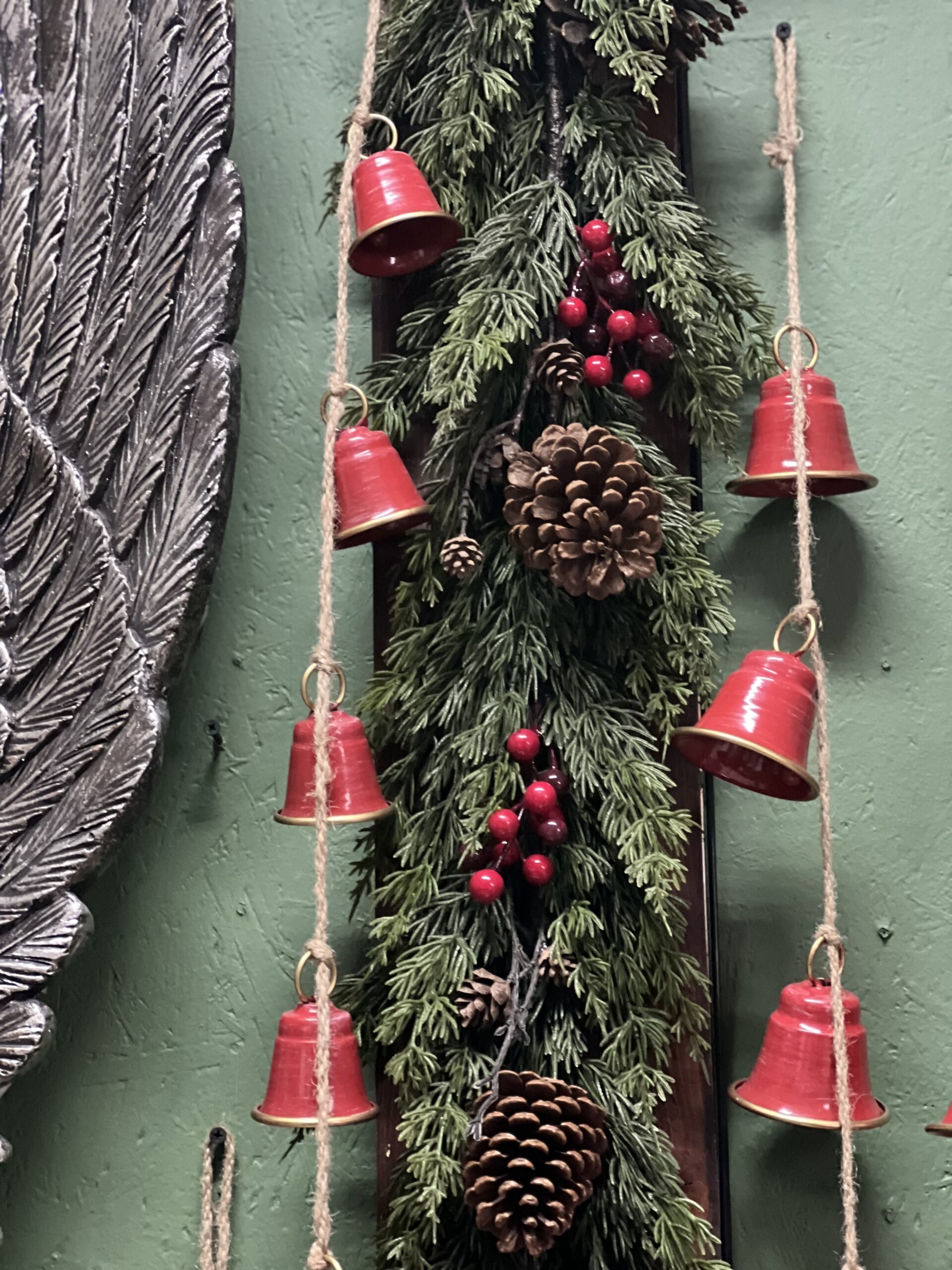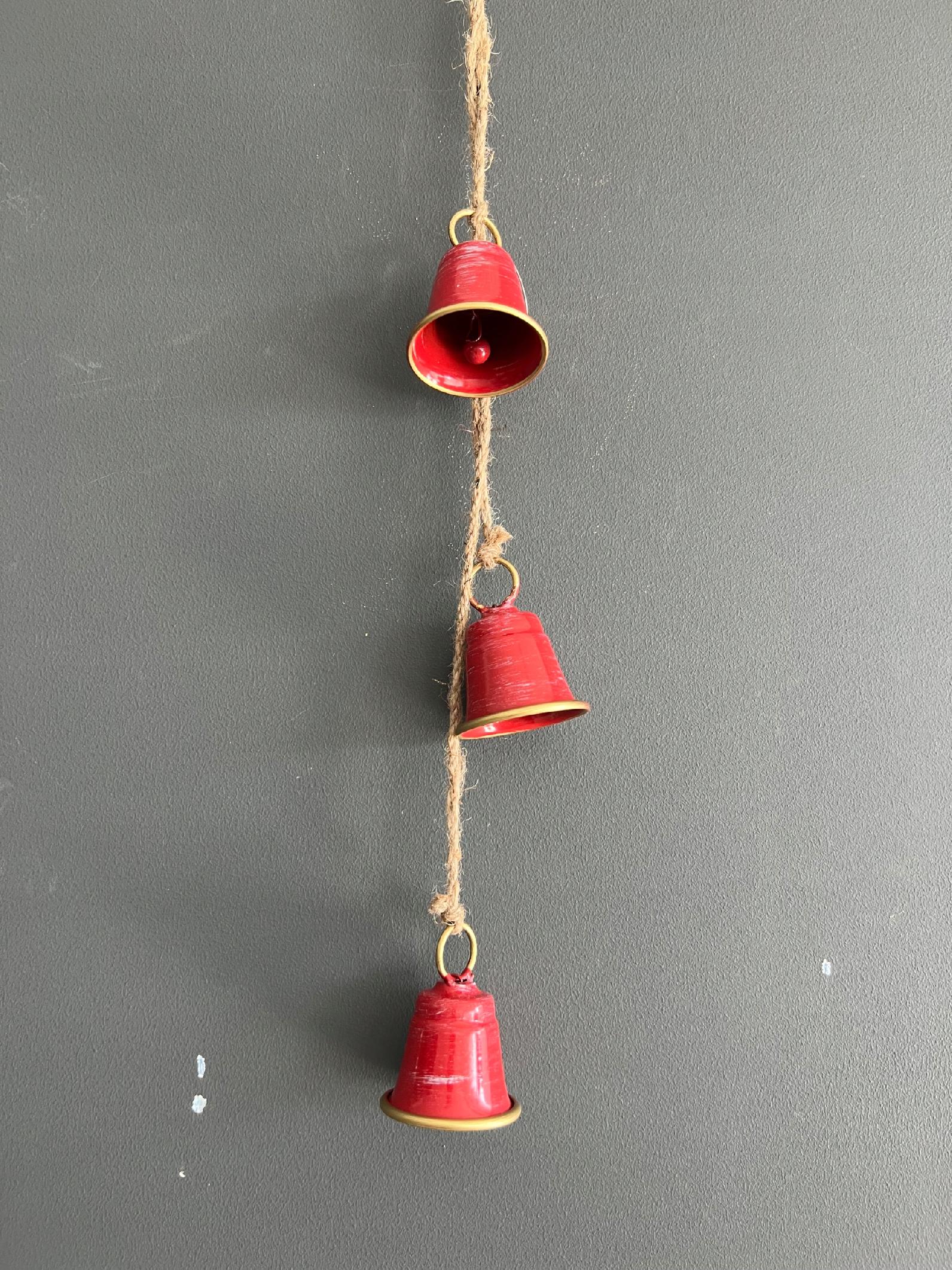 3 dzwoneczki w kolorze czerwonym z przetarciami na ozdobnym sznurem.