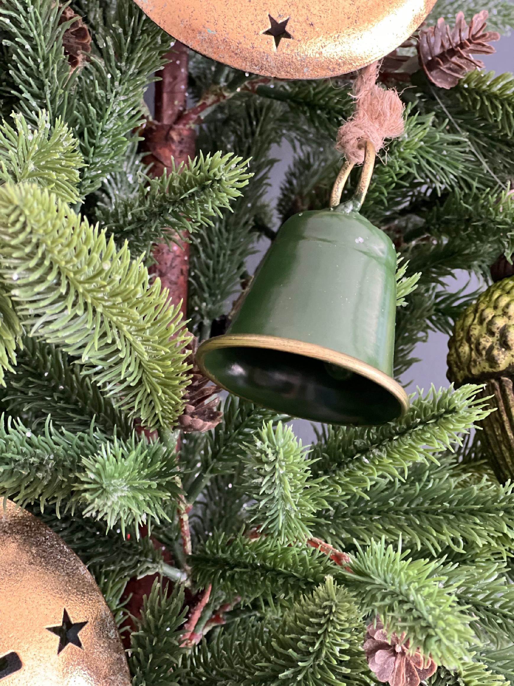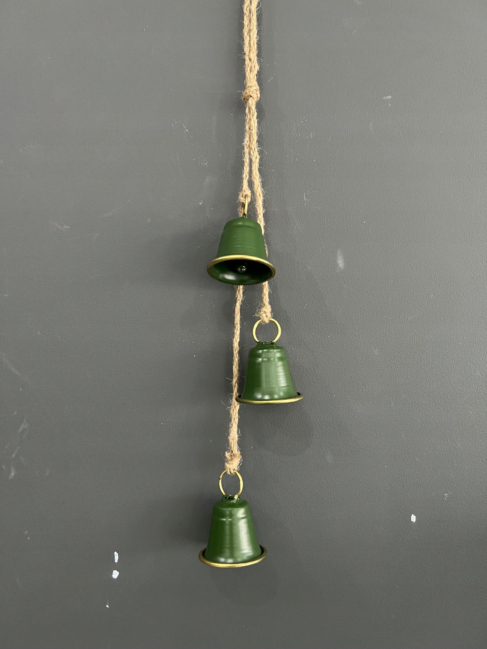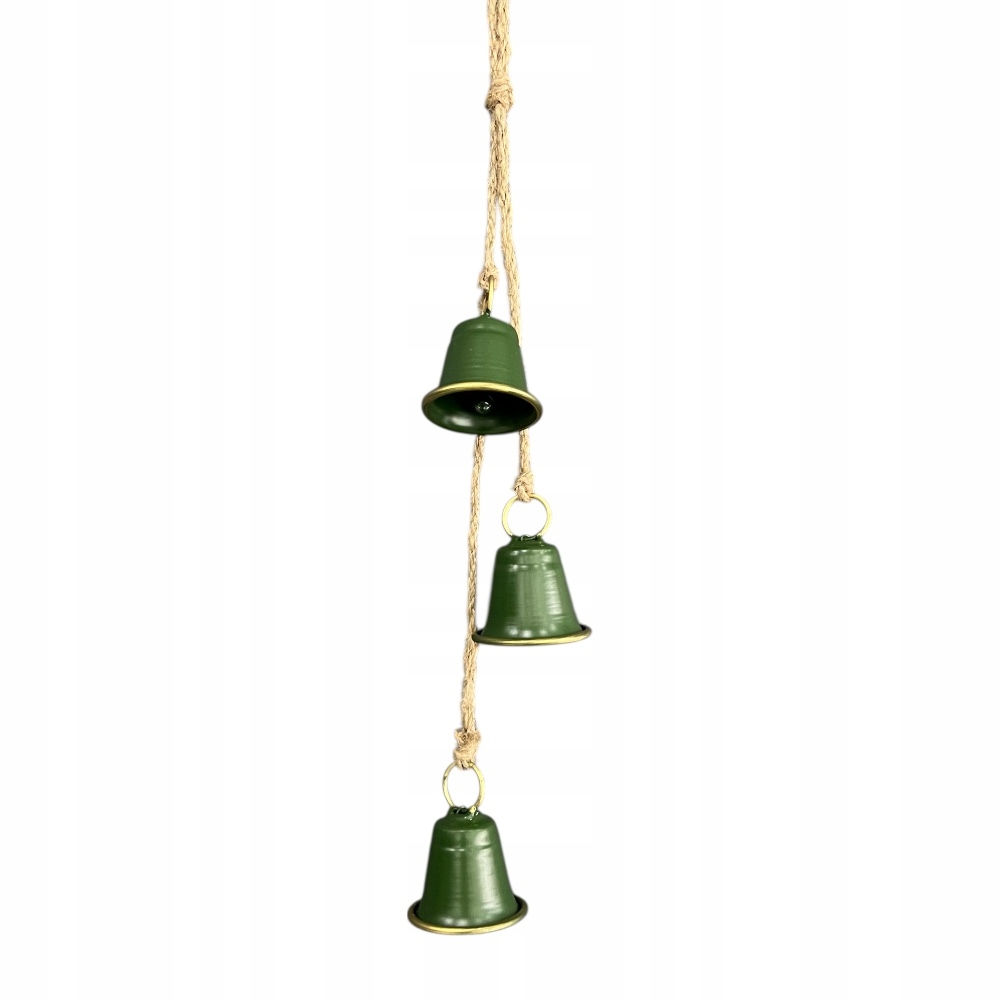 3 dzwoneczki w zielonej kolorystyce na ozdobnym sznurem.