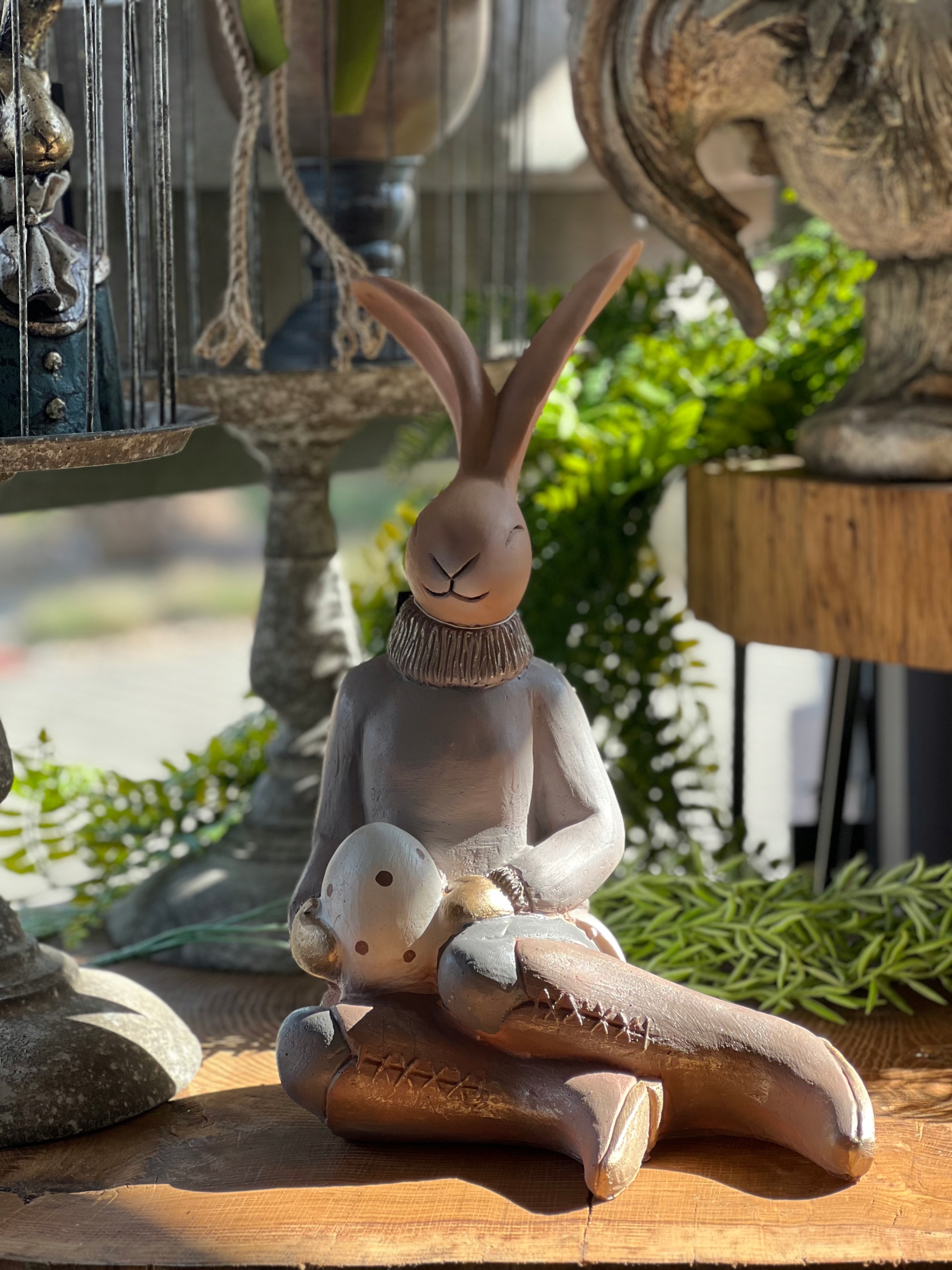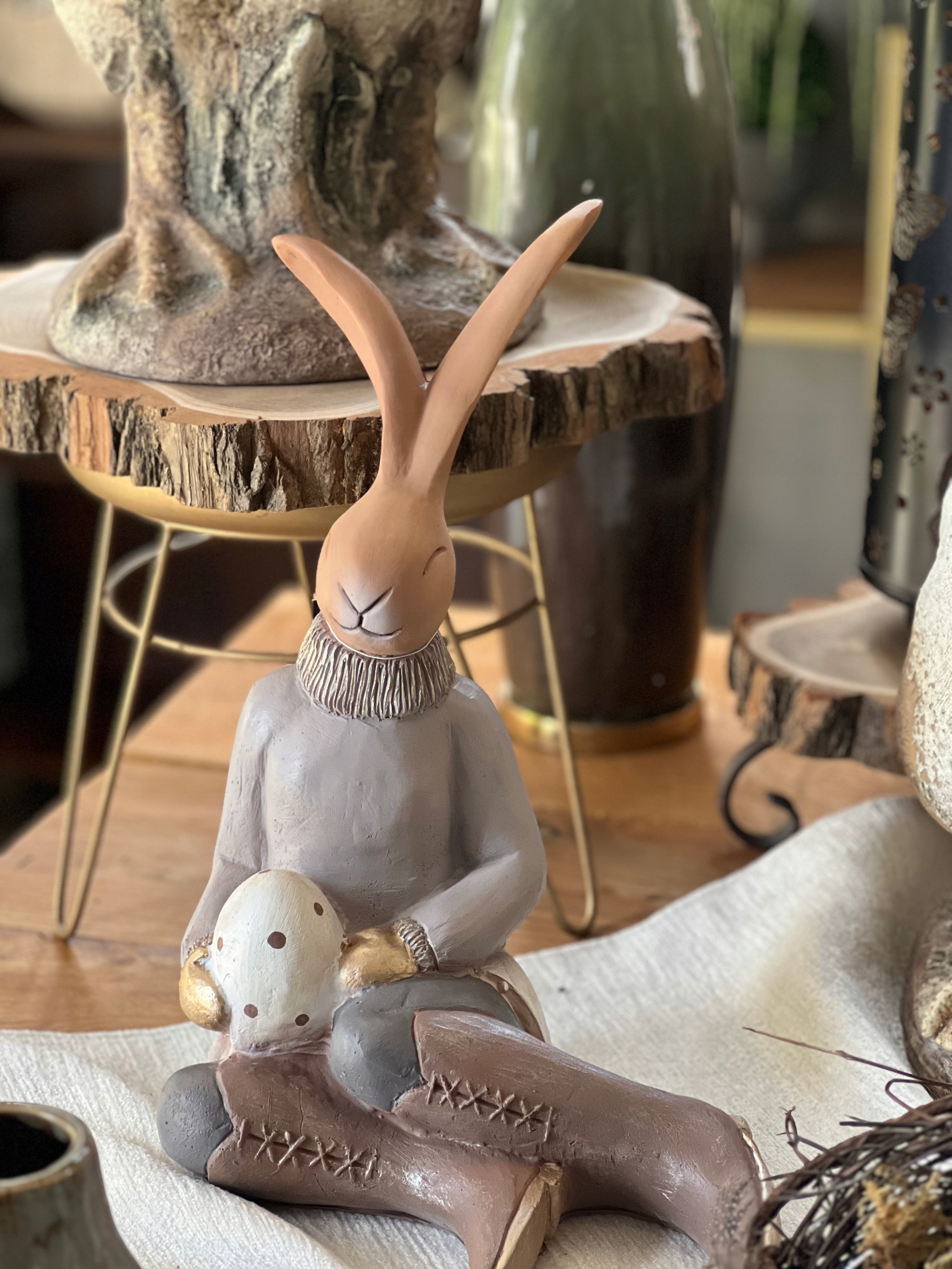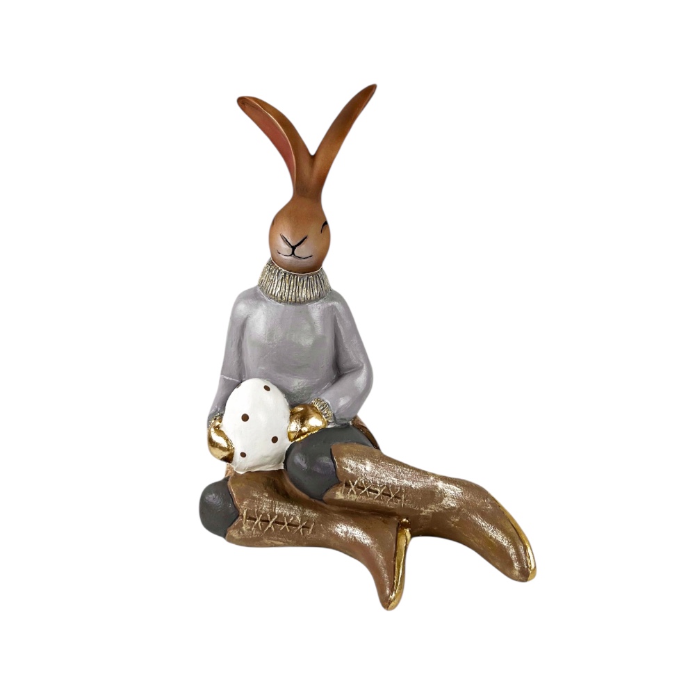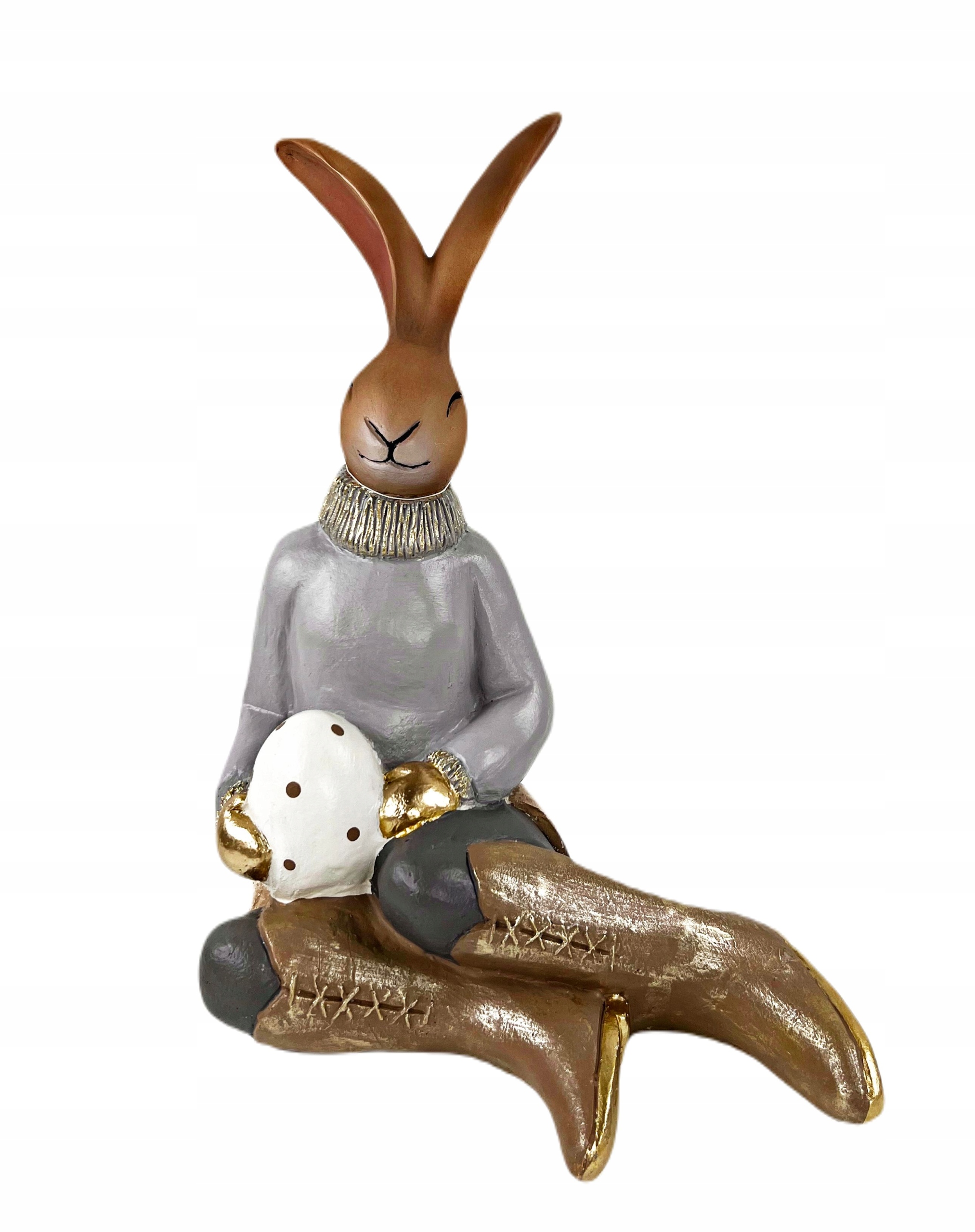 Oryginalna figurka siedzącego zająca trzymającego jajo wielkanocne