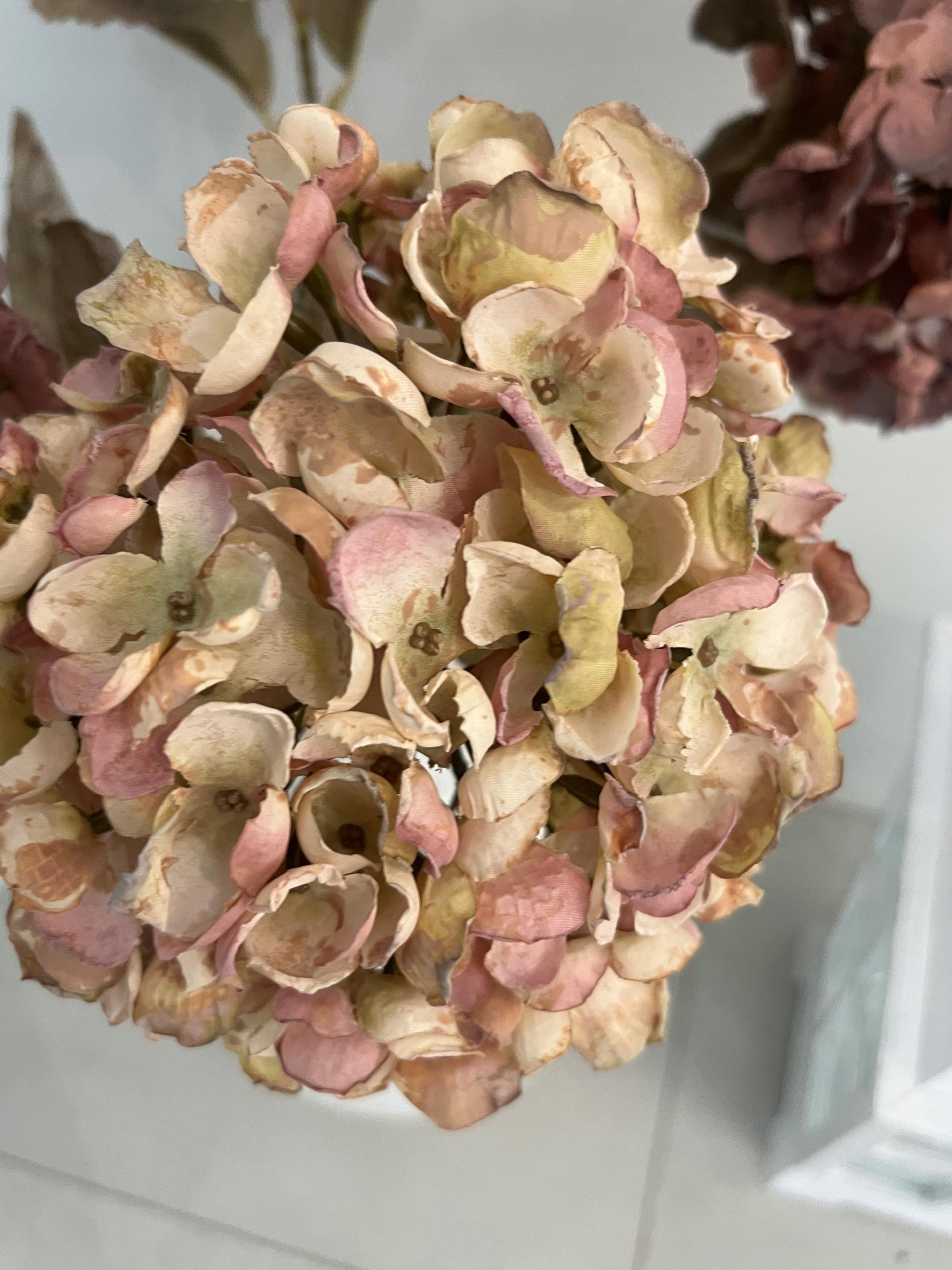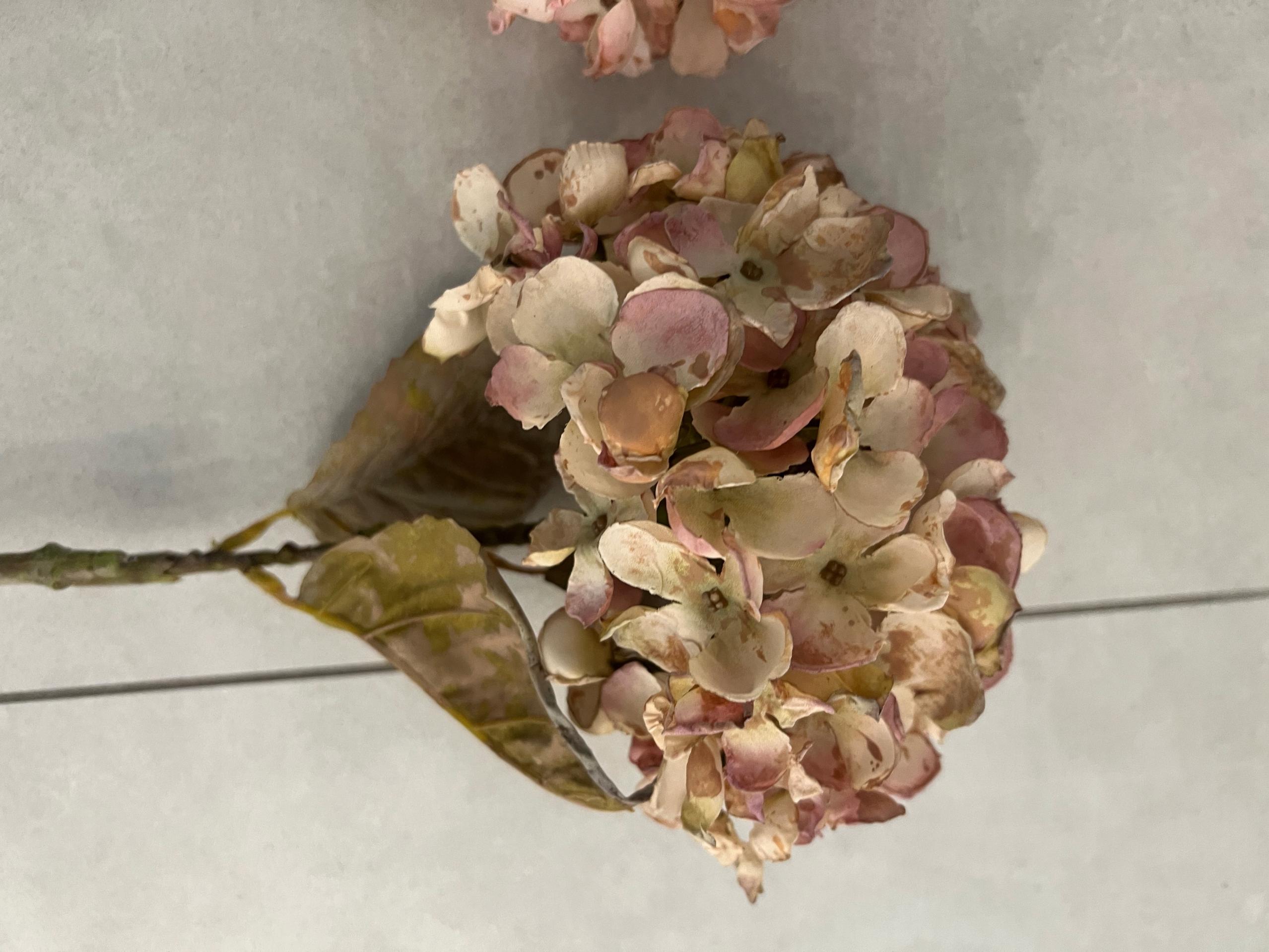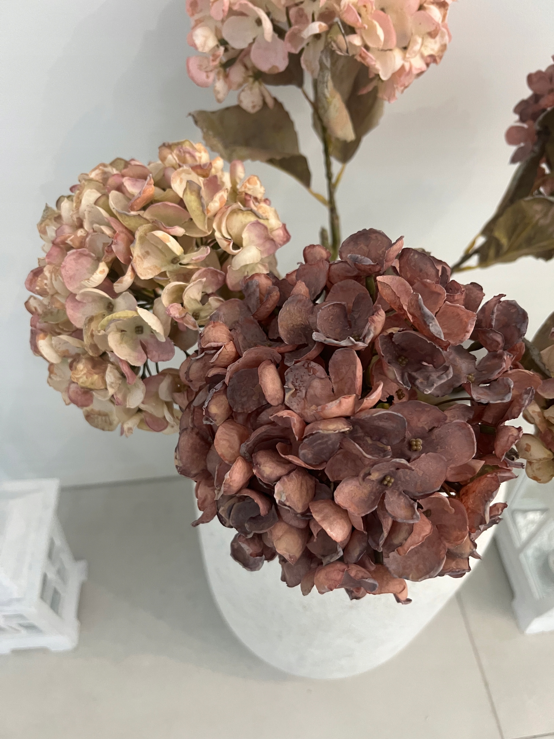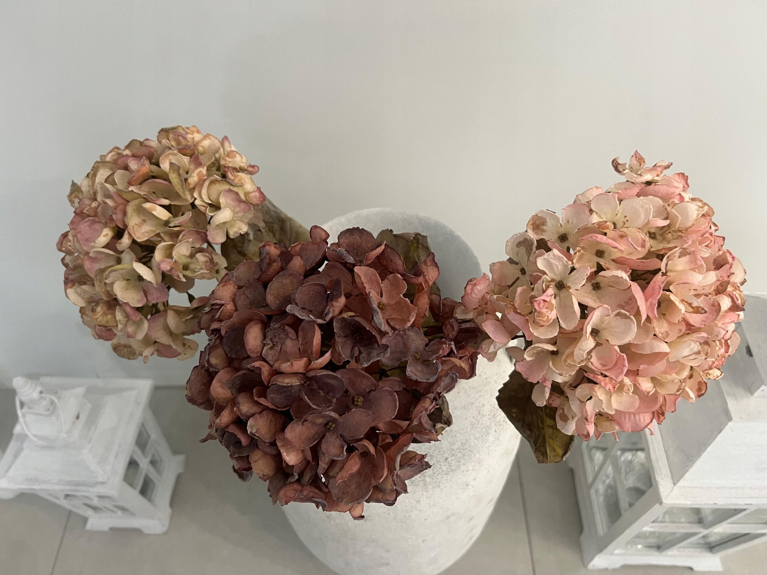 Piękne suszone gałązki o dużych głowach hortensji w trzech kolorach w odcieniach beżowych.