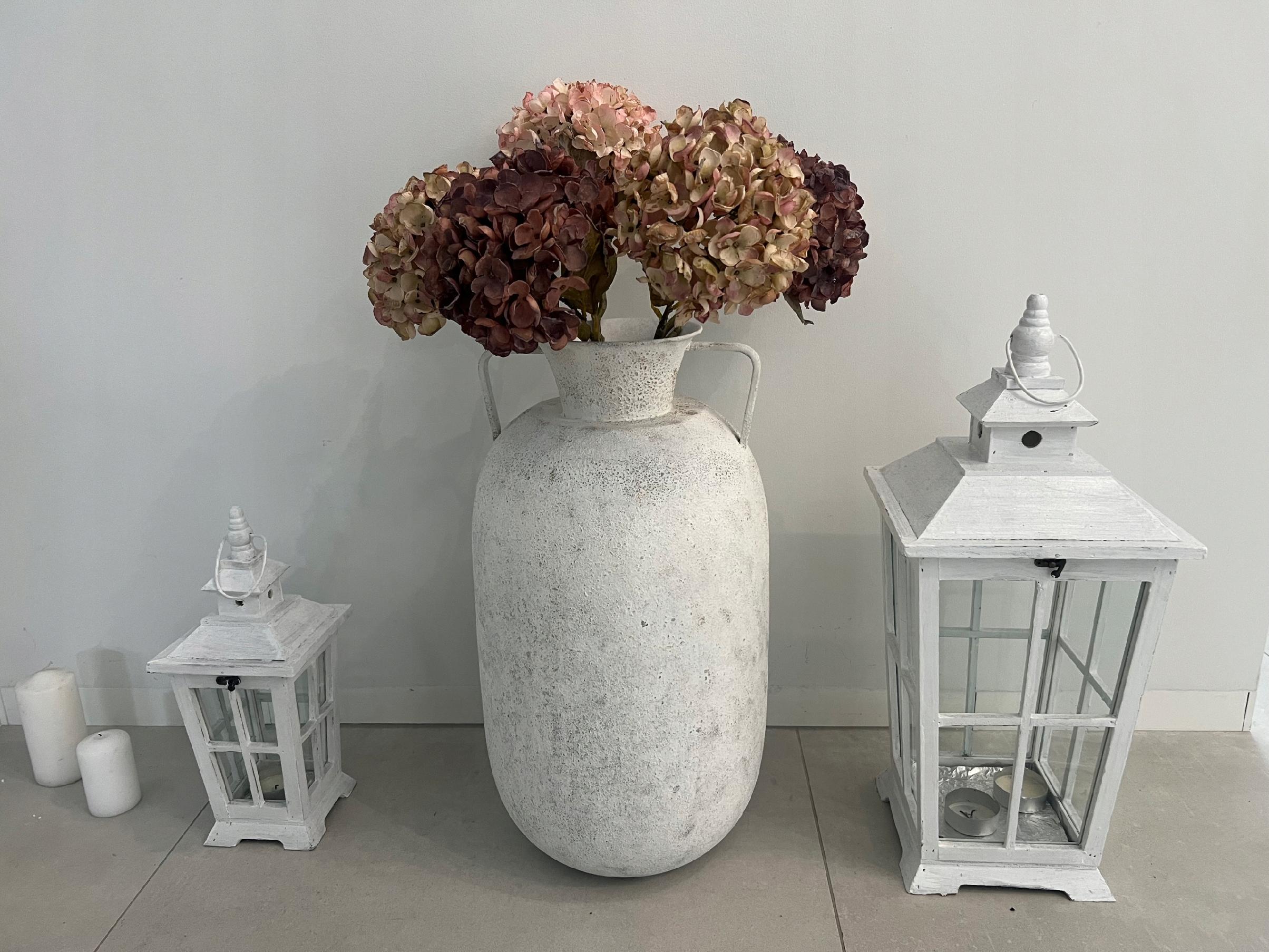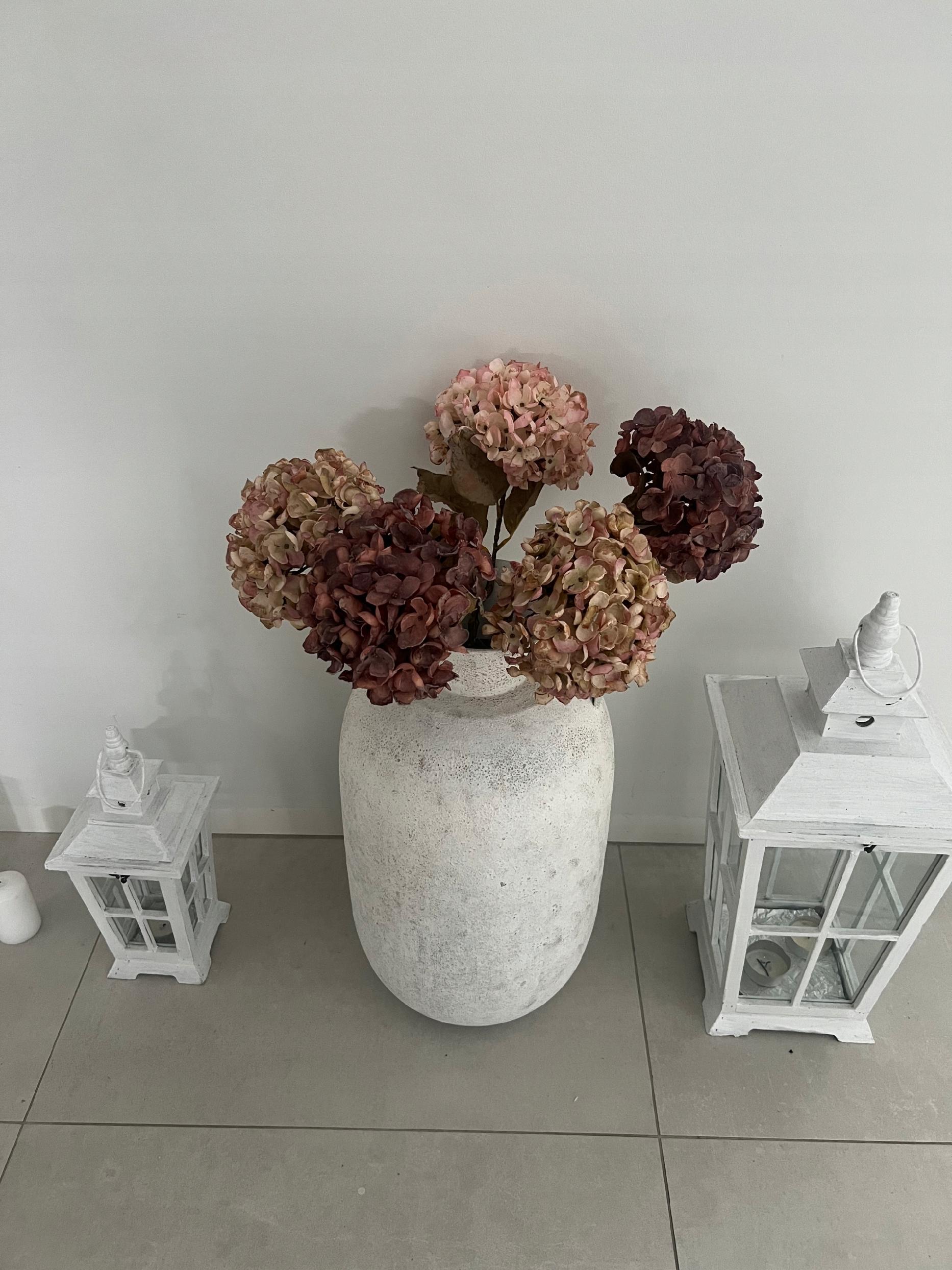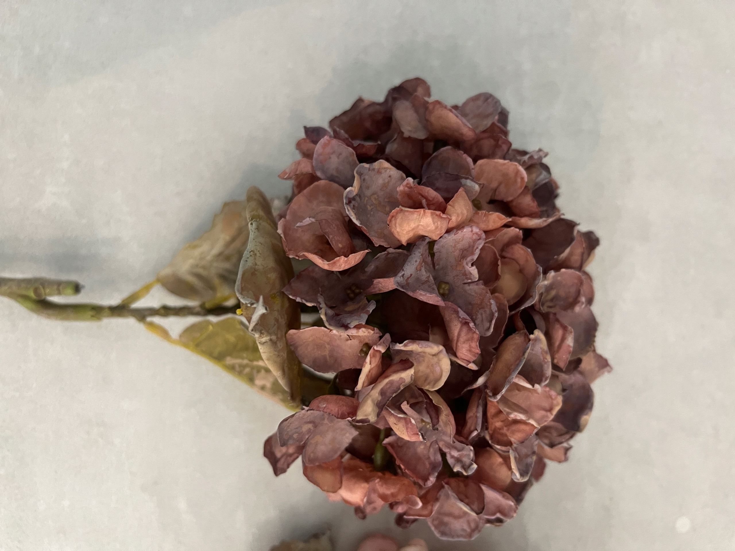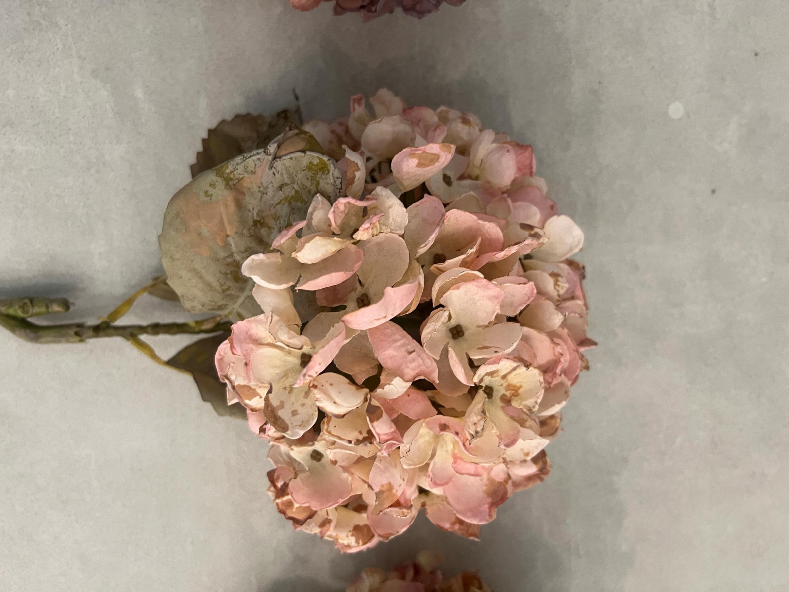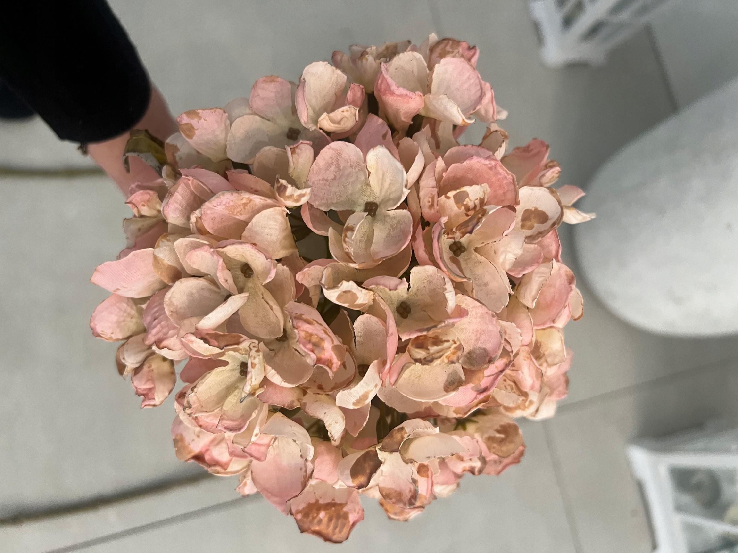 Piękne suszone gałązki o dużych głowach hortensji w trzech kolorach w odcieniach beżowych.