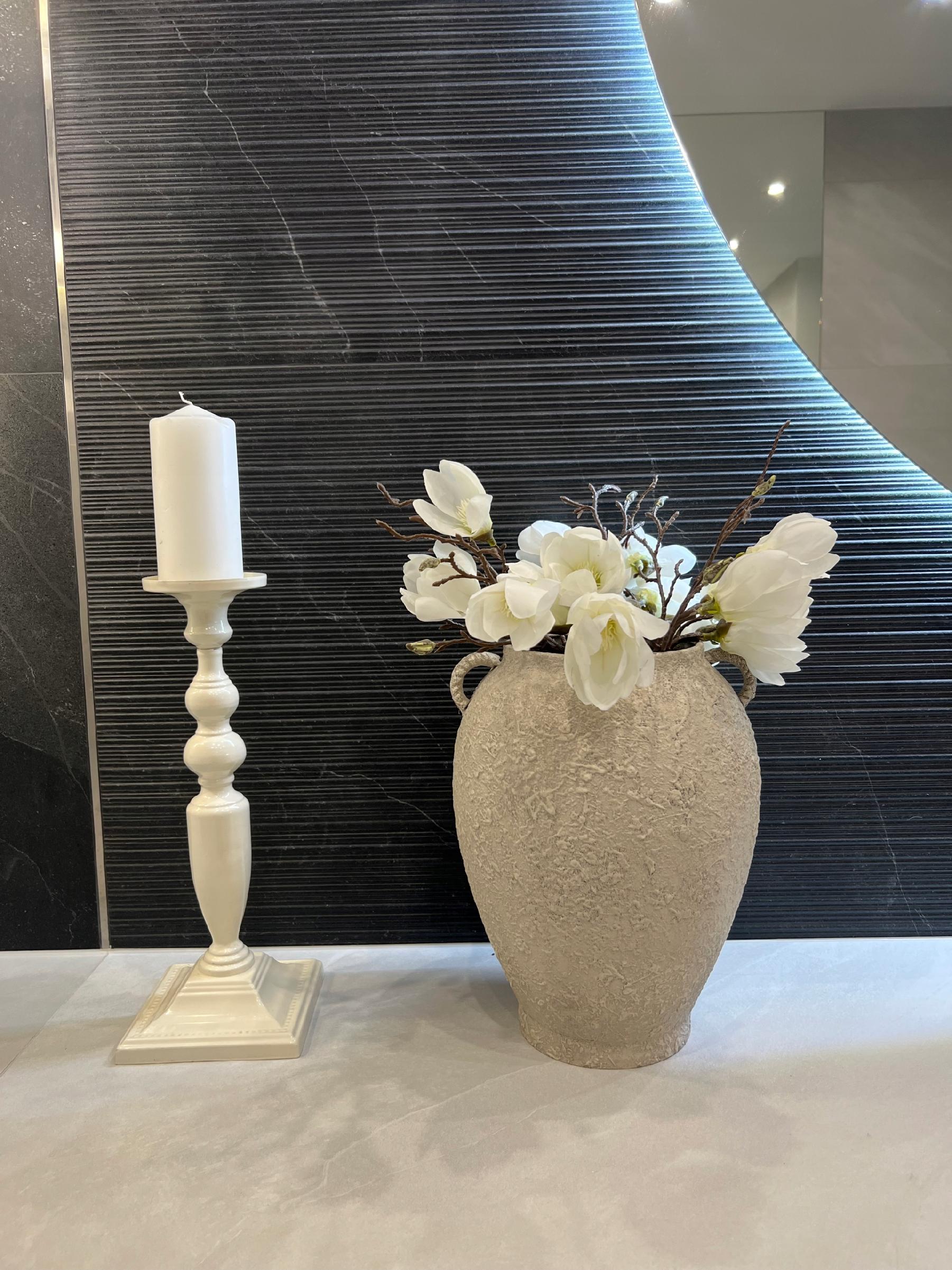 Ten  wazon pasuje również do nowoczesnych pomieszczeń, ale pięknie ozdobi, salon, taras, hol, lobby witrynę sklepową czy recepcję.