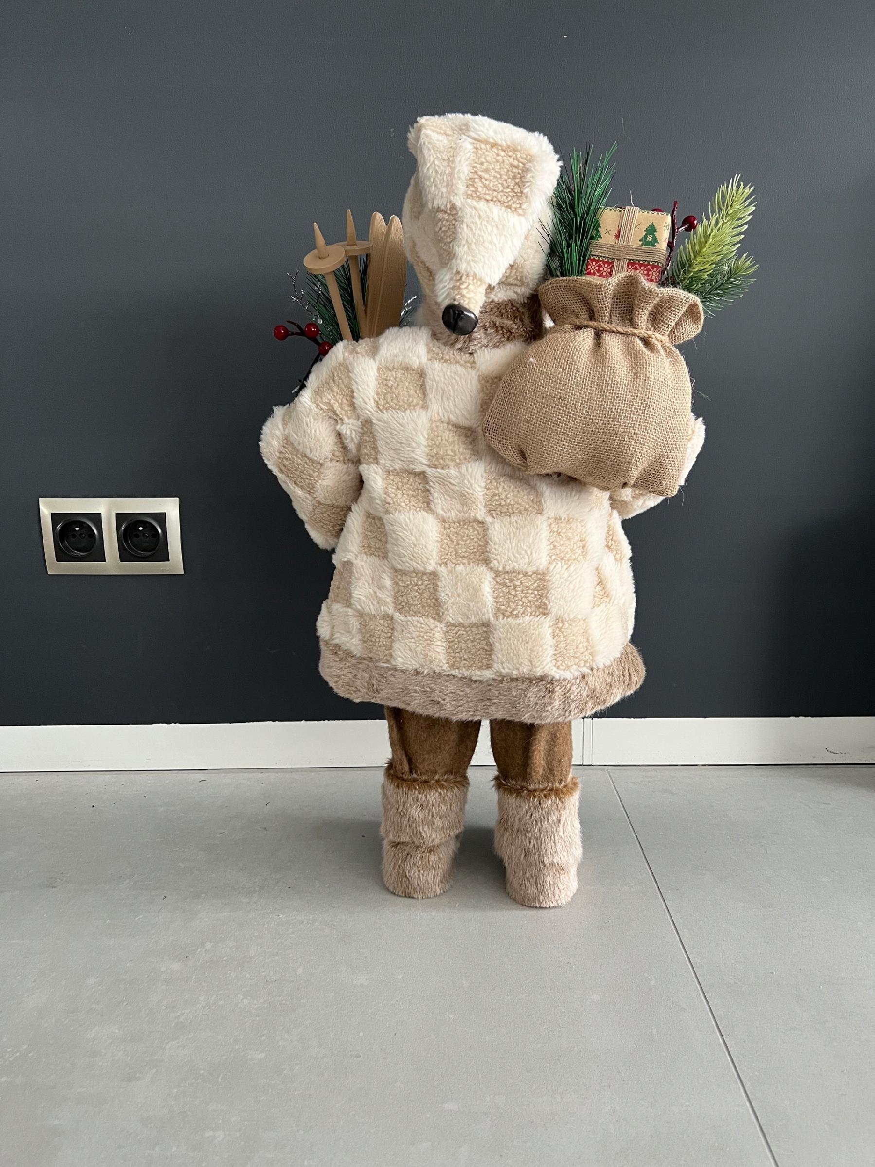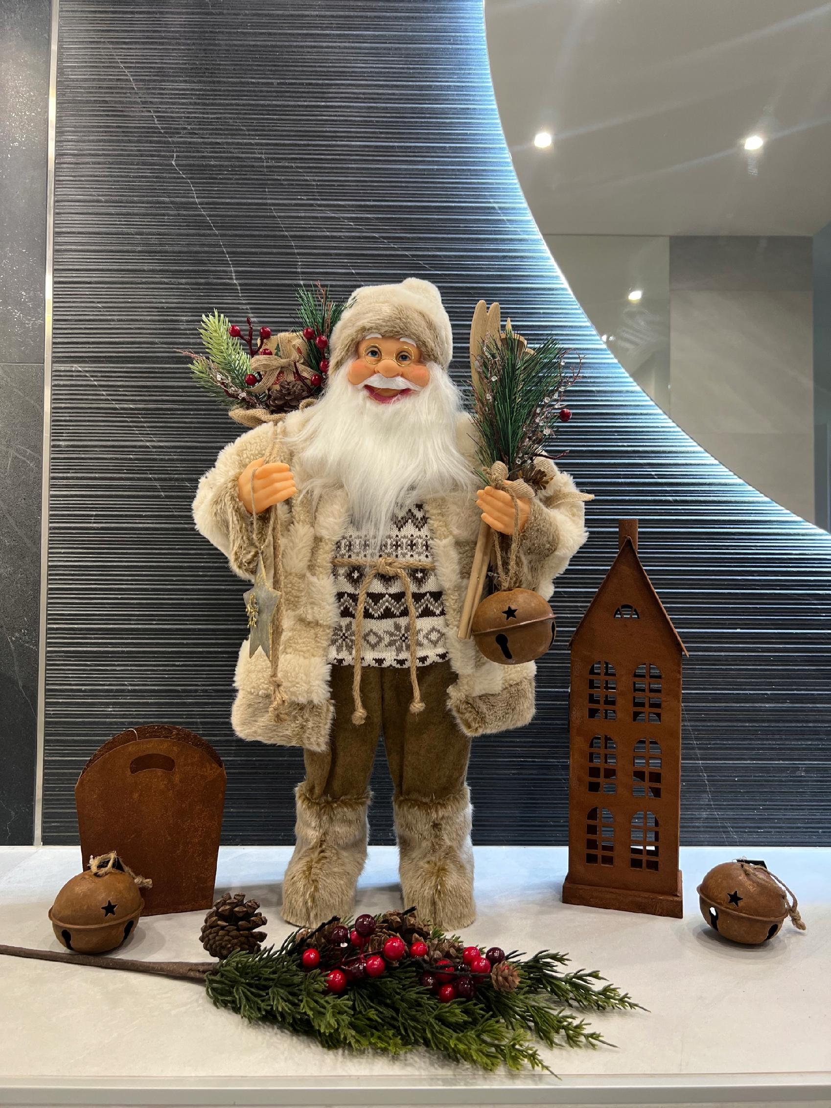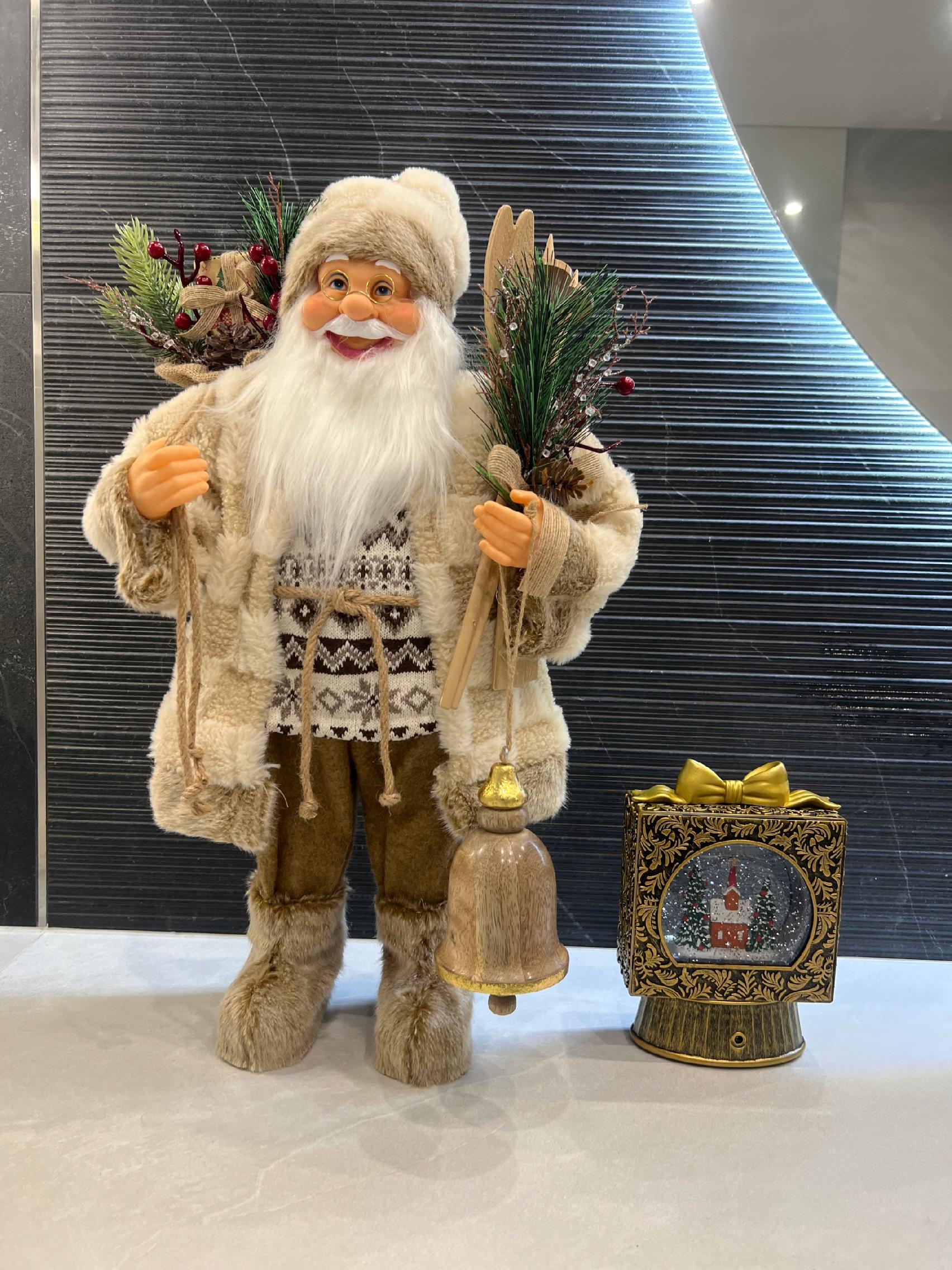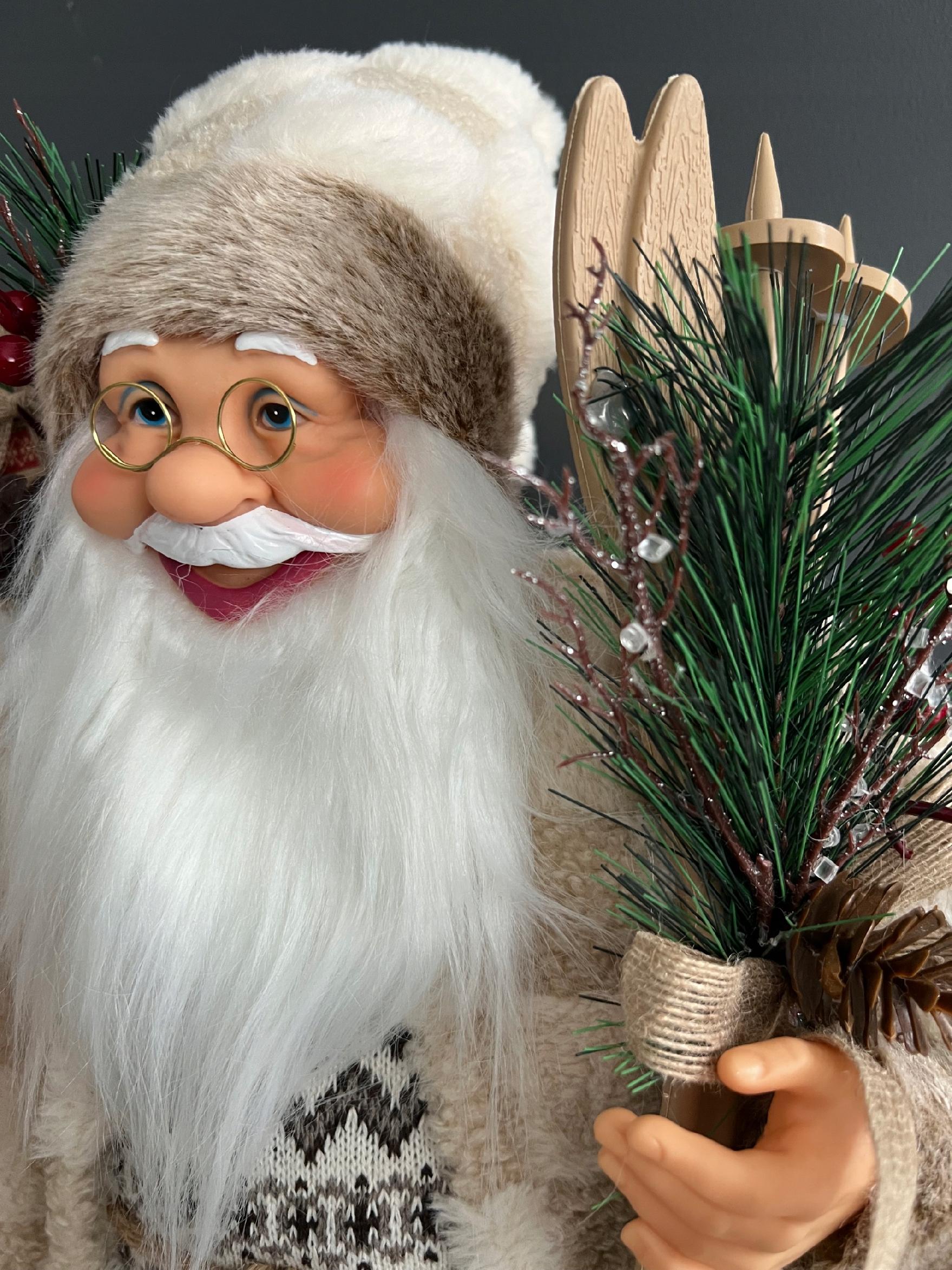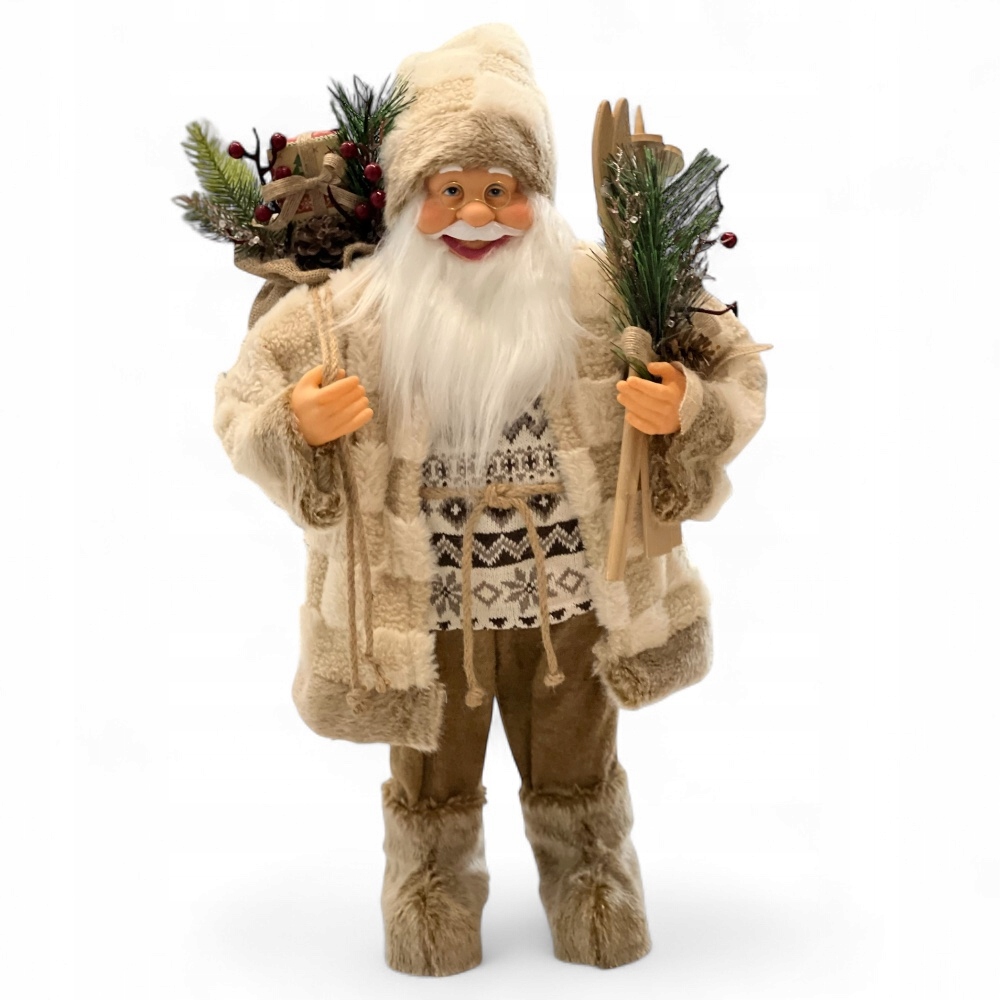 W eleganckim zdobnym stroju, wysoki na 61 cm z workiem prezentów i nartami w ręku, zachwyci każdego gościa