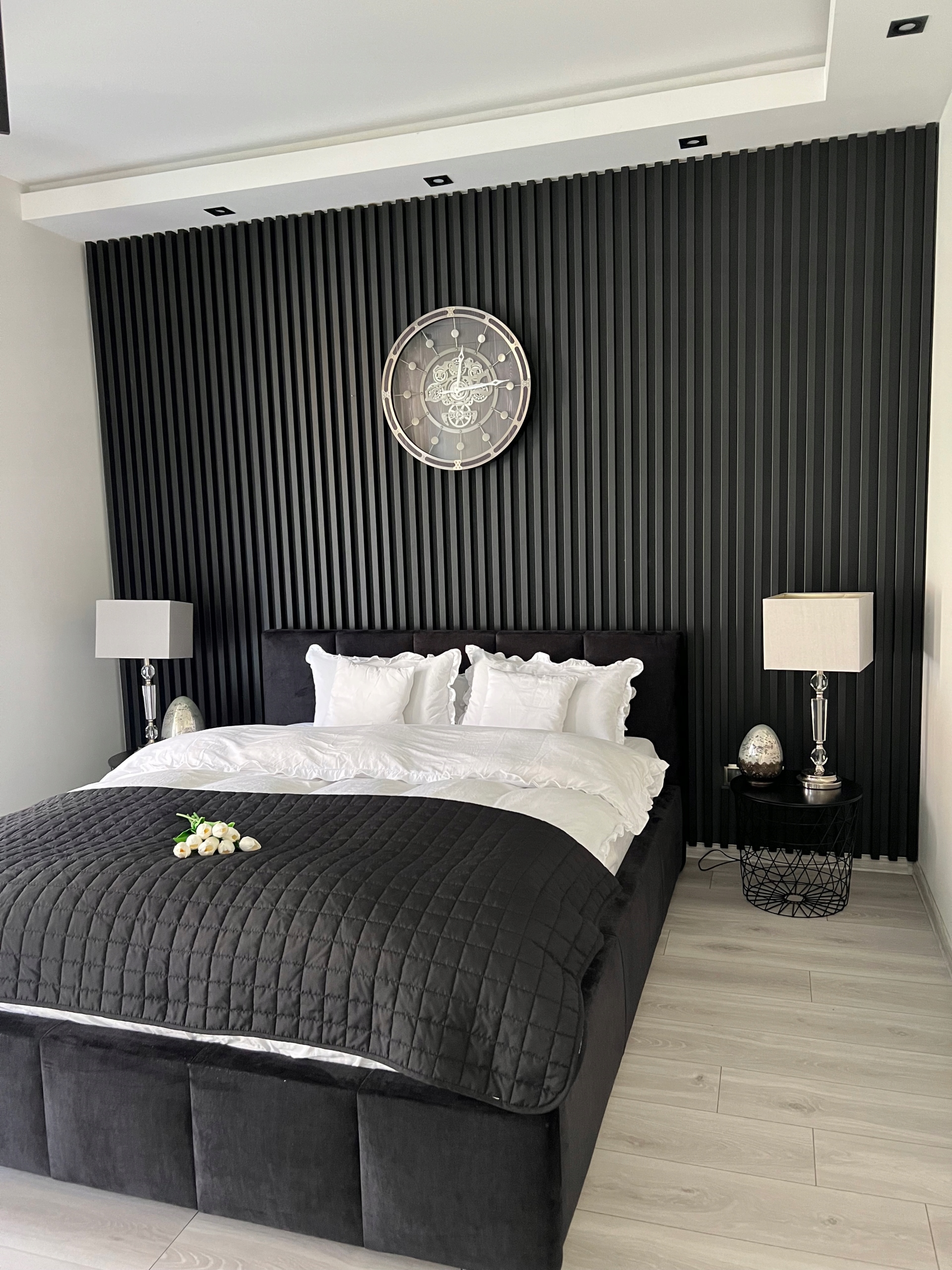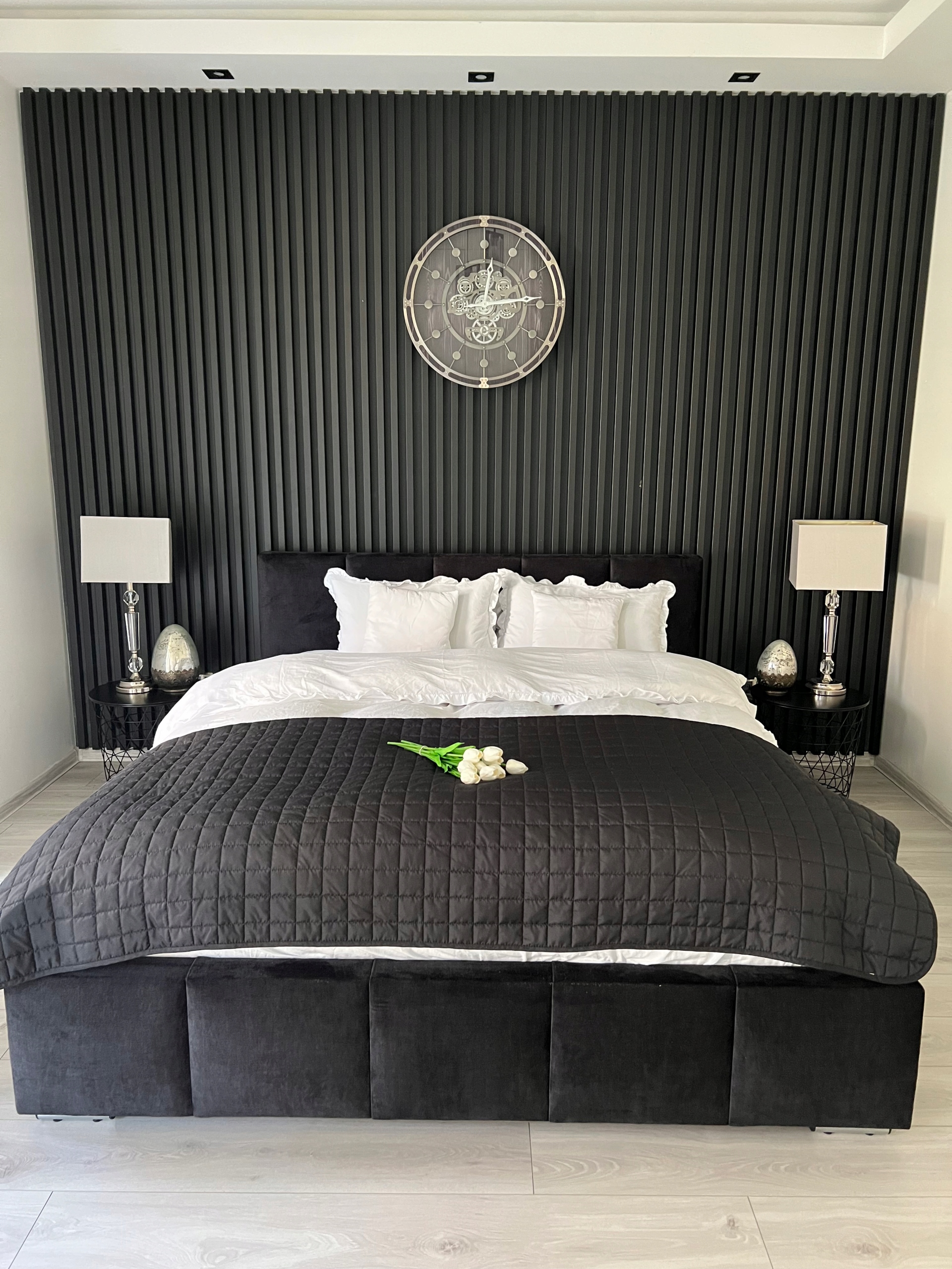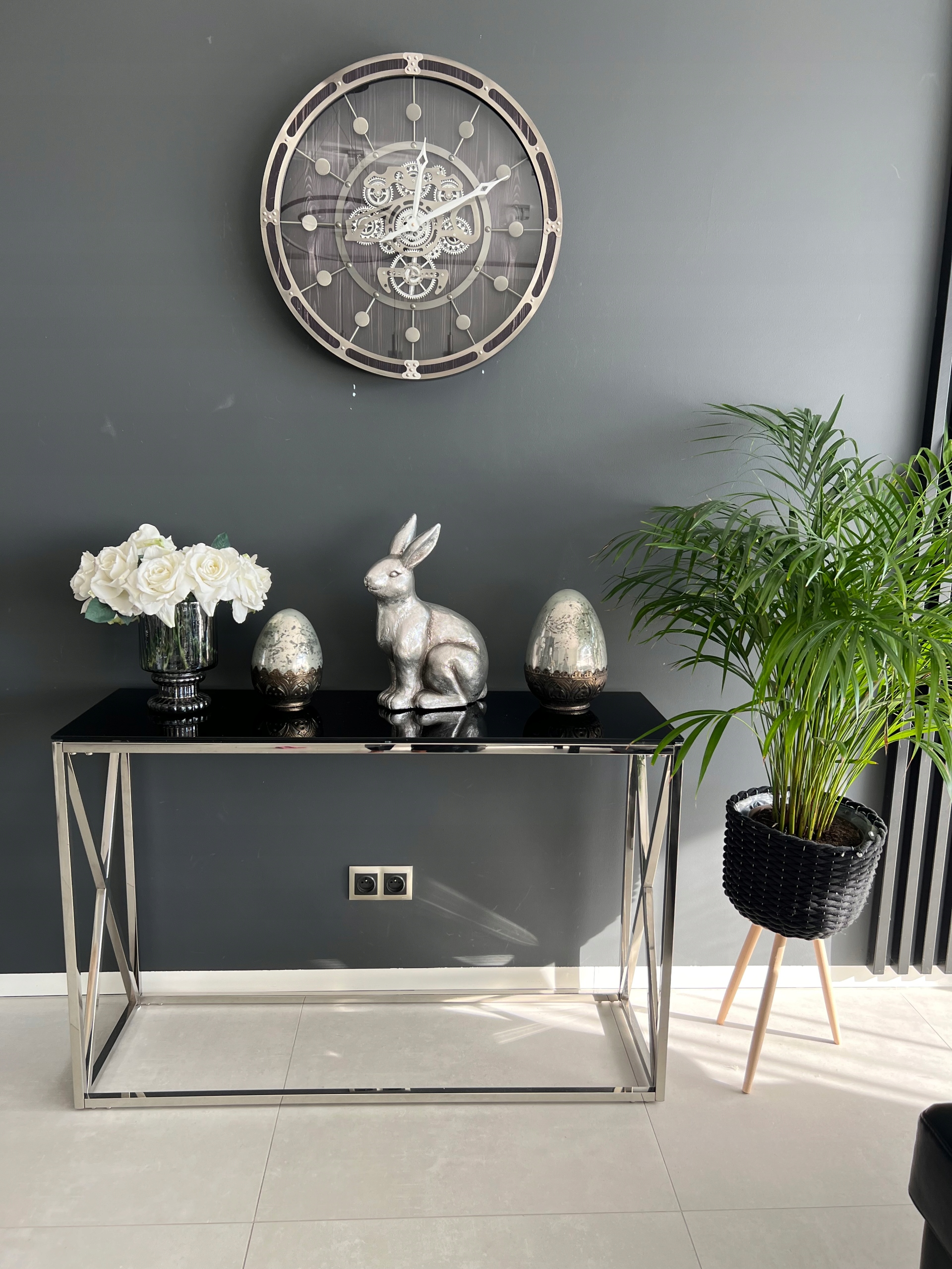 Piękny czarny, srebrny zegar ścienny, wykonany z wysokiej jakości materiałów.